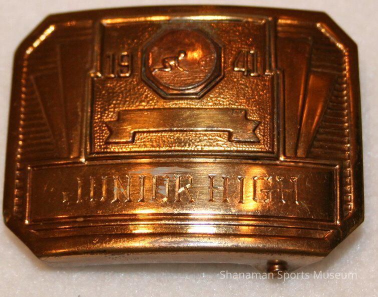 A belt buckle depicts the Junior High Marble Champion award earned by Vernon Keister. Marbles was a very popular game of chance played by children from about 4,000 B.C. played in Rome and ancient Egypt. The game migrated to Europe and the United States, with children playing the game in the streets, playgrounds and in backyards.Lexicon