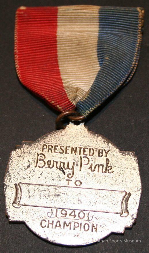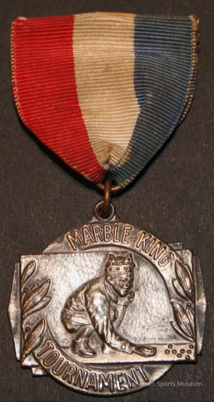 A commutative red, white and blue-striped ribbon depicts a medallion with an etching declaring the winner of the 1940 Marble King tournament. The medal was won by Vernon Keister. Marbles was a very popular game of chance played by children from about 4,000 B.C. played in Rome and ancient Egypt. The game migrated to Europe and the United States, with children playing the game in the streets, playgrounds and in backyards.Lexicon