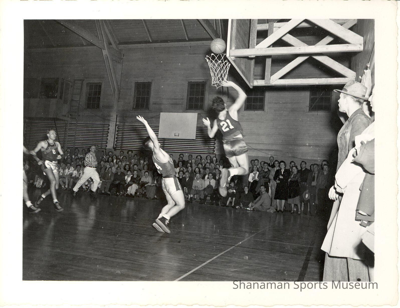 B/w photograph of the College of Puget Sound basketball team playing at the Warner Gym at UPS, 1950s. #21 may be Bob Angeline.Relationships