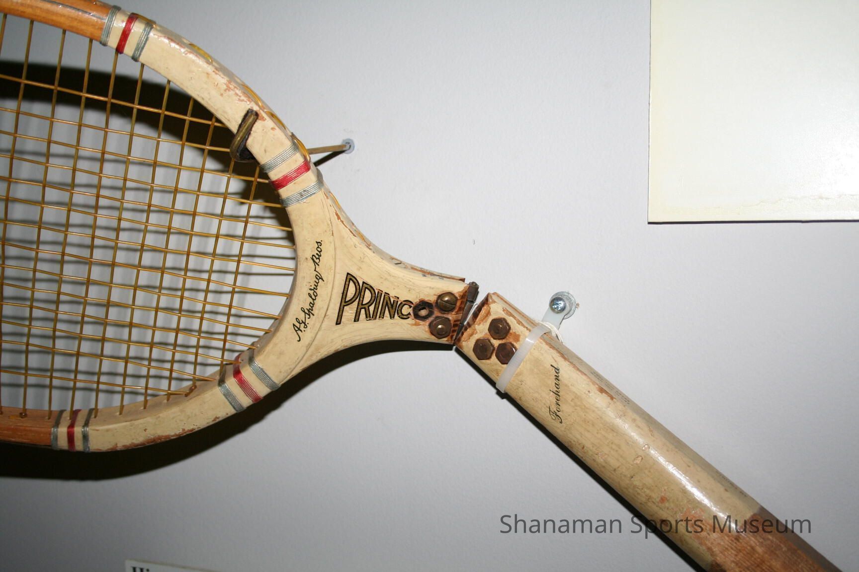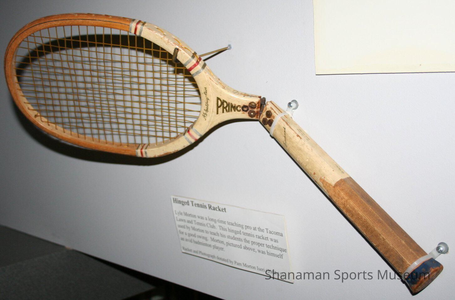 Tennis racket, Prince, wooden, hinged. Practice racket used by students of Lyle Morton to teach proper tennis swing (proper wrist position).