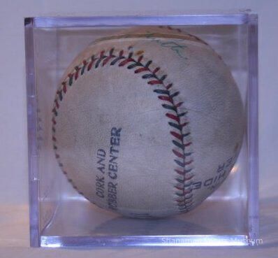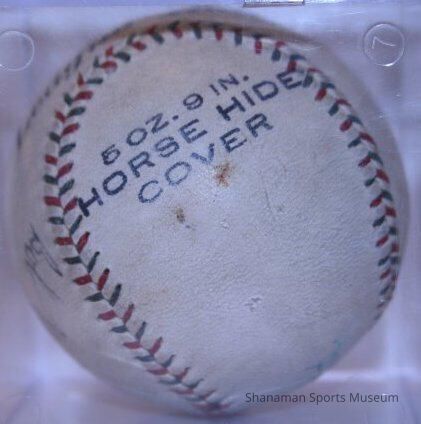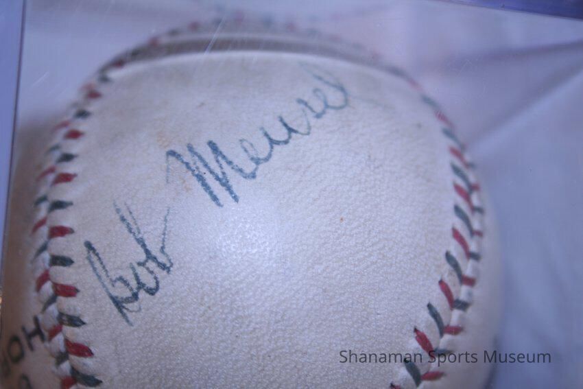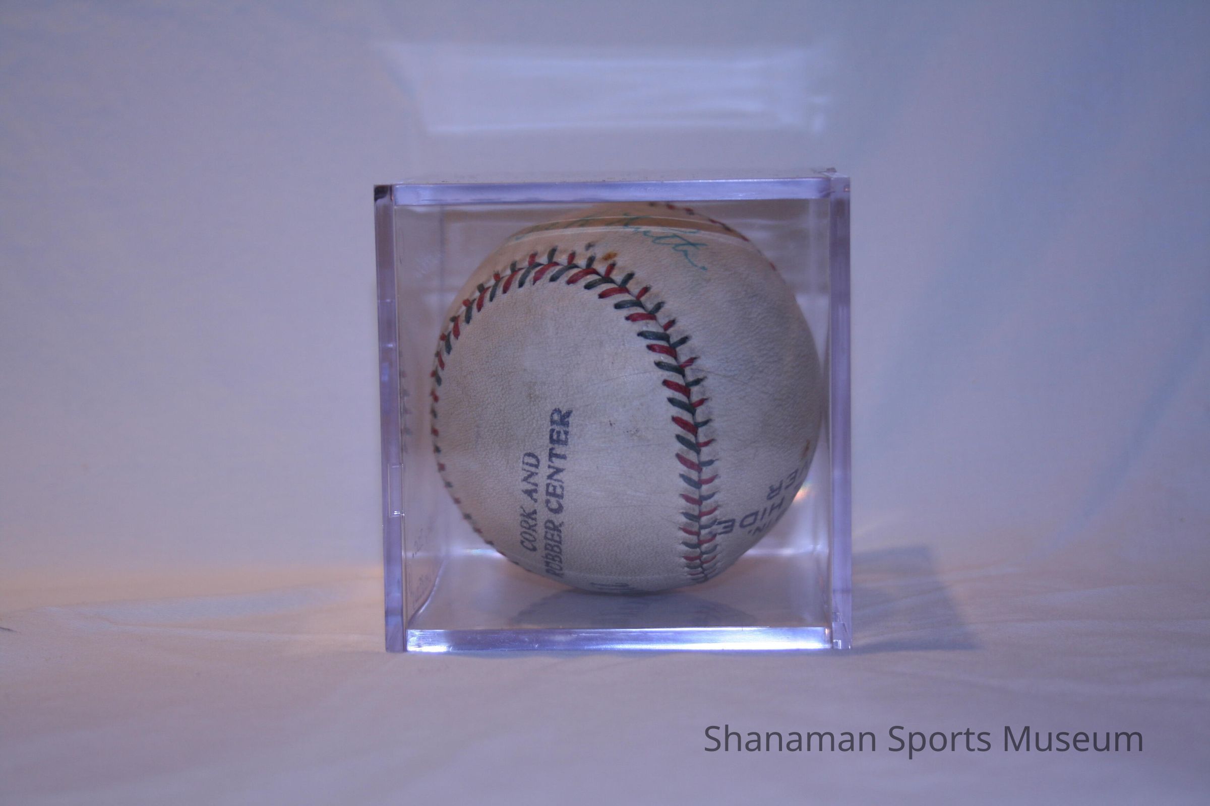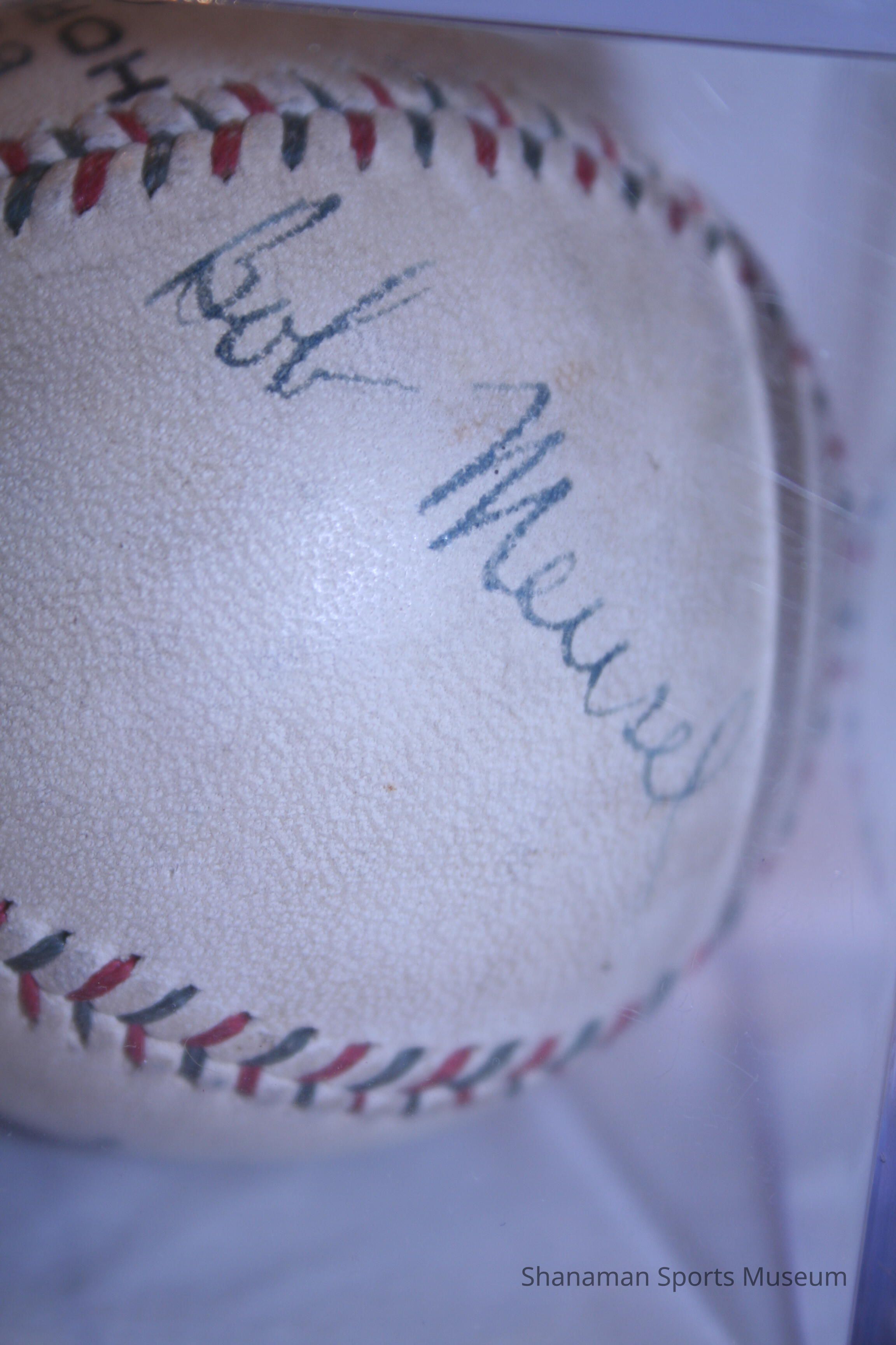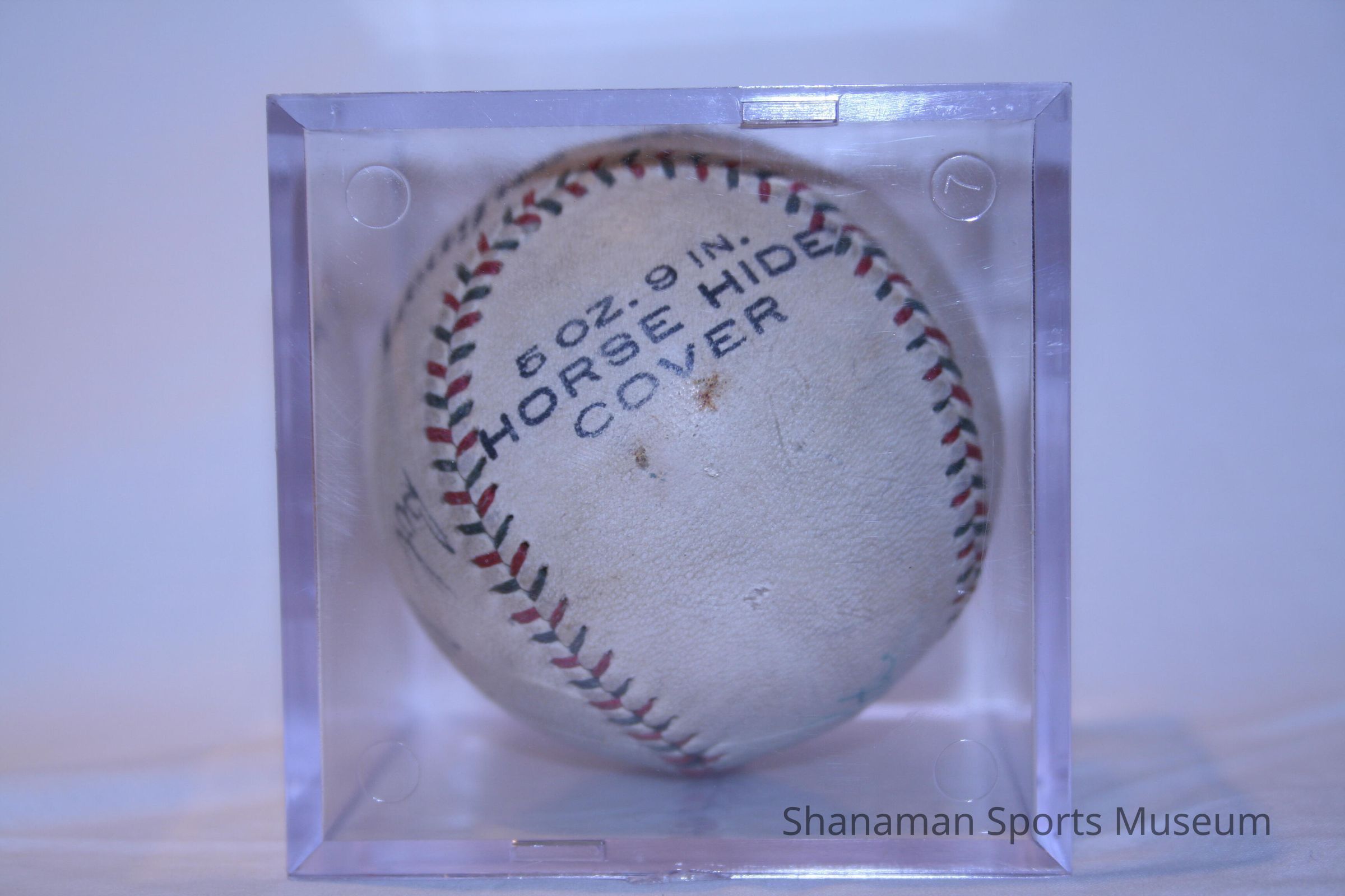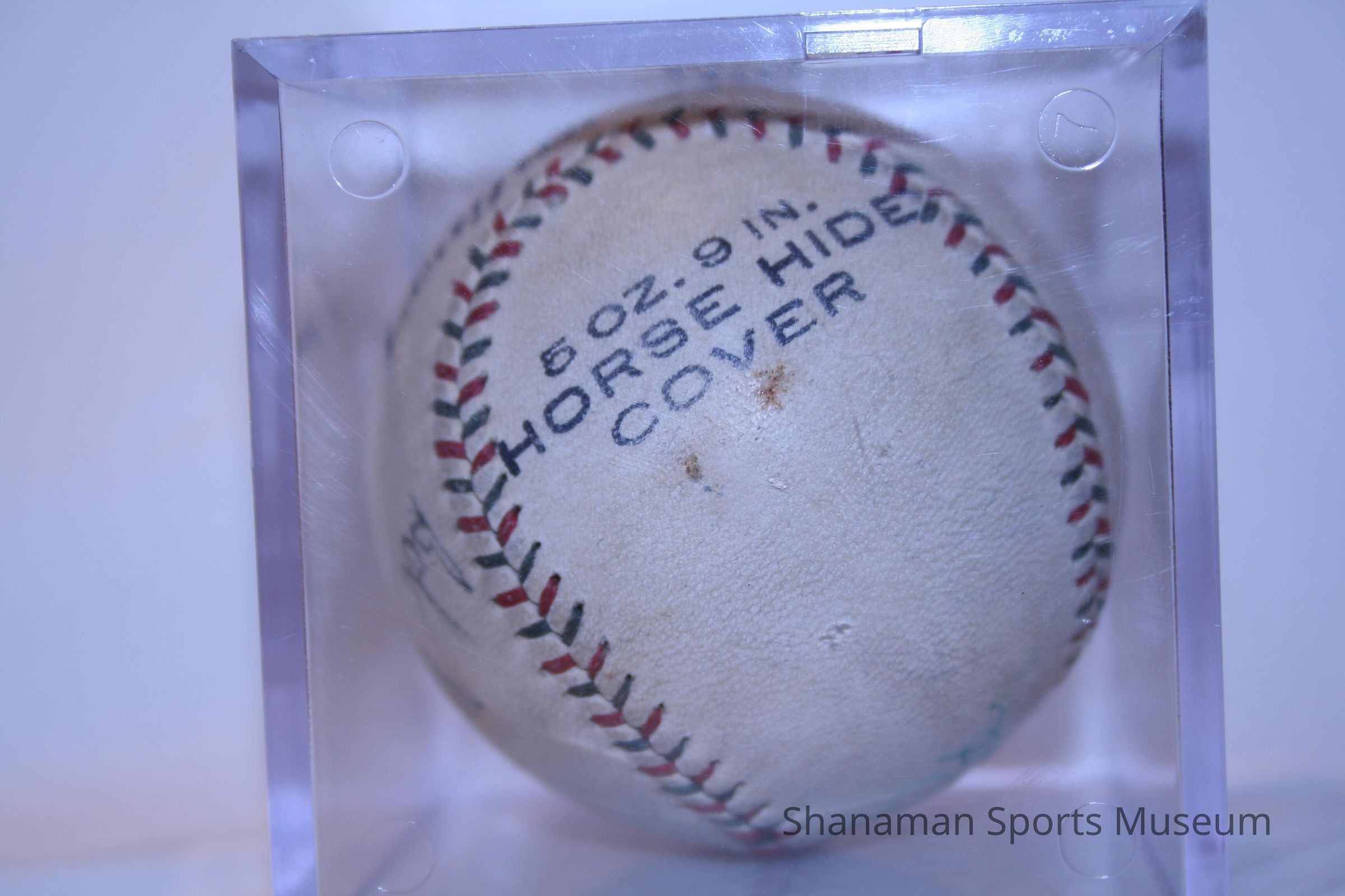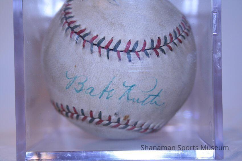 Baseball, D & M brand, "Official League Ball". Autographed. "Babe Ruth" in green ink, "Bob Meusel" in black ink. Ball is in protective display case. On Display.Relationships