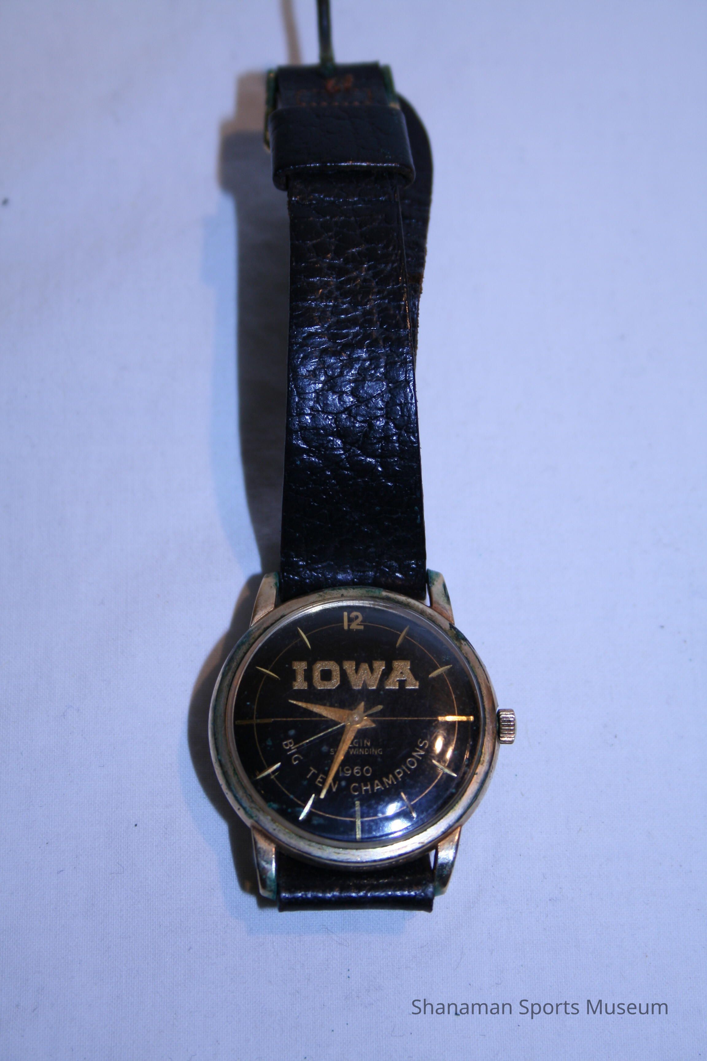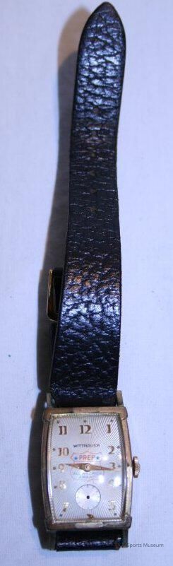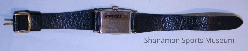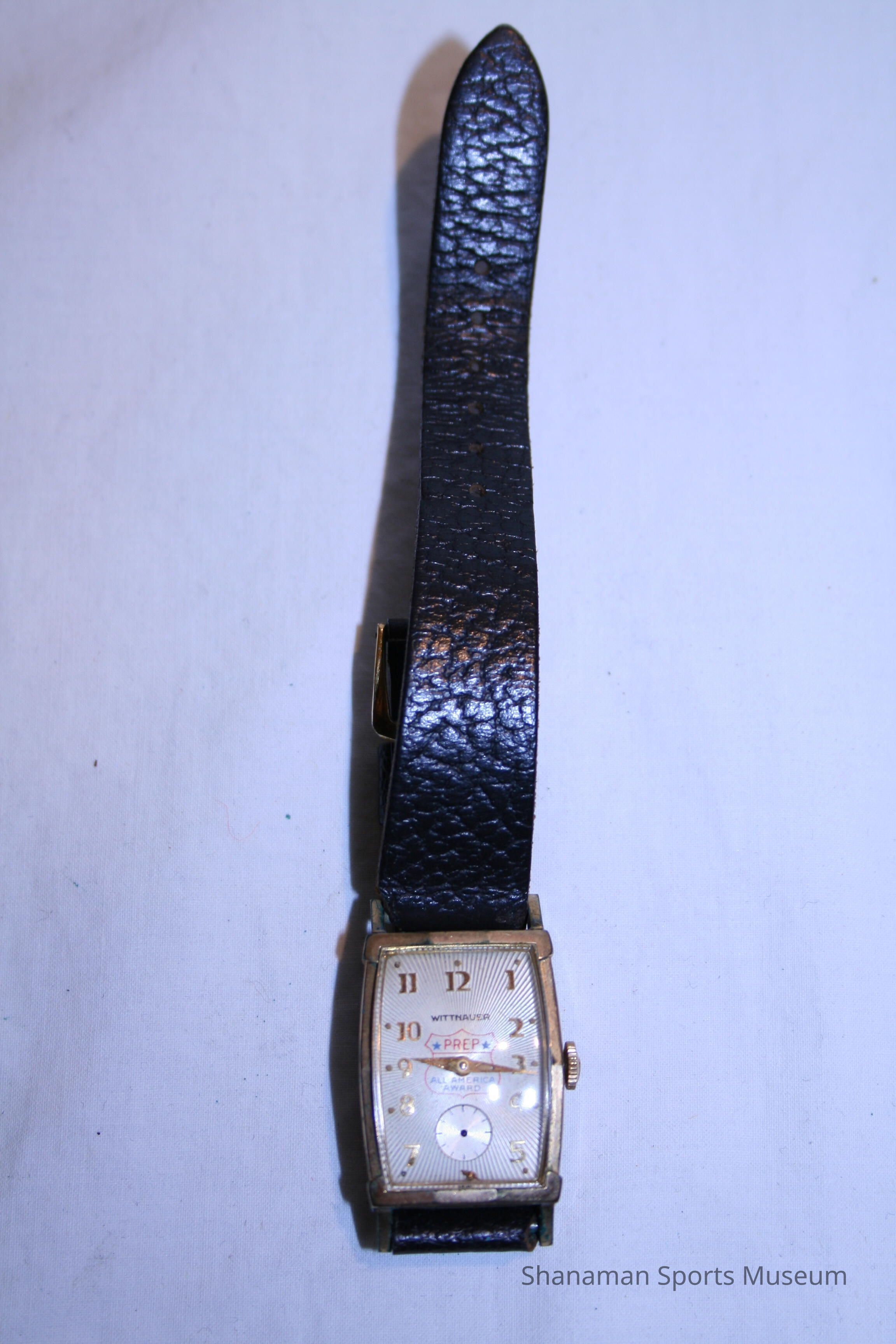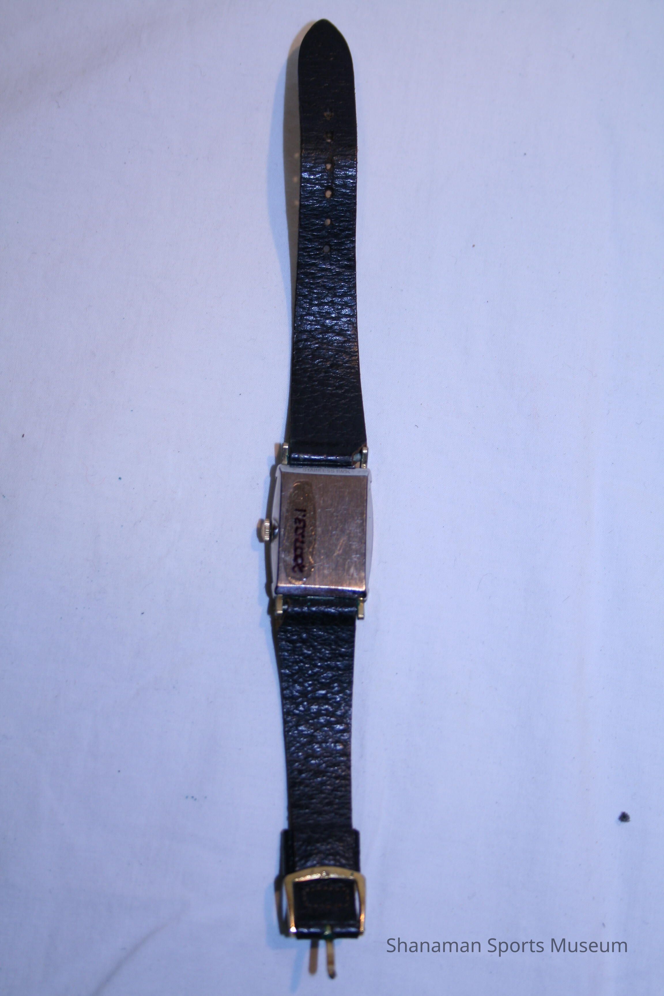 An All American Prep Award watch belonging to Lincoln High’s Jerry Williams features a black leather strap, rectangular gold frame and clasp, gold numbers and hands.