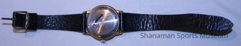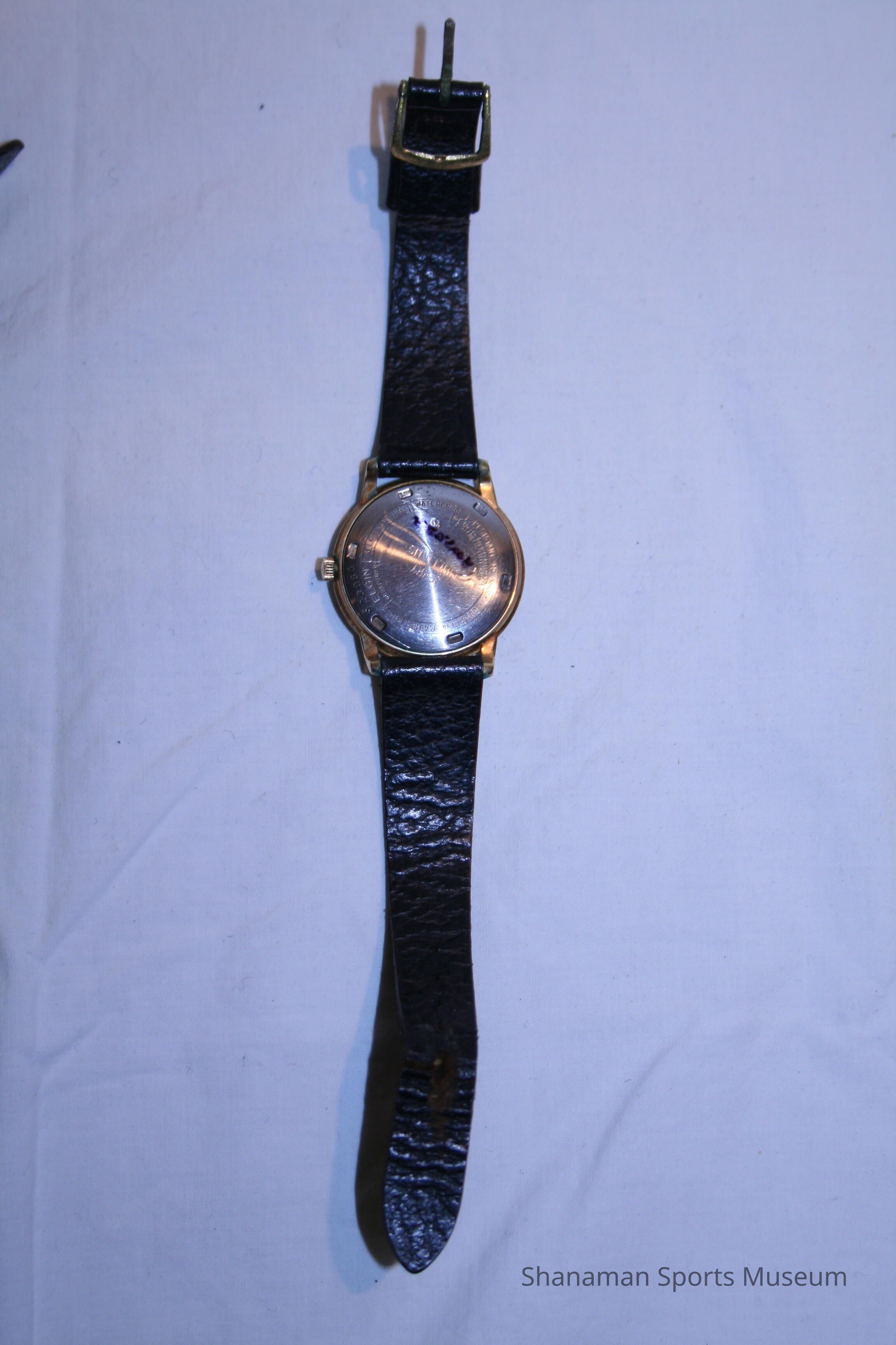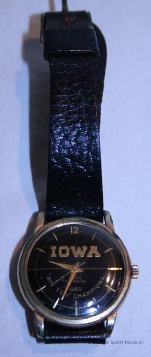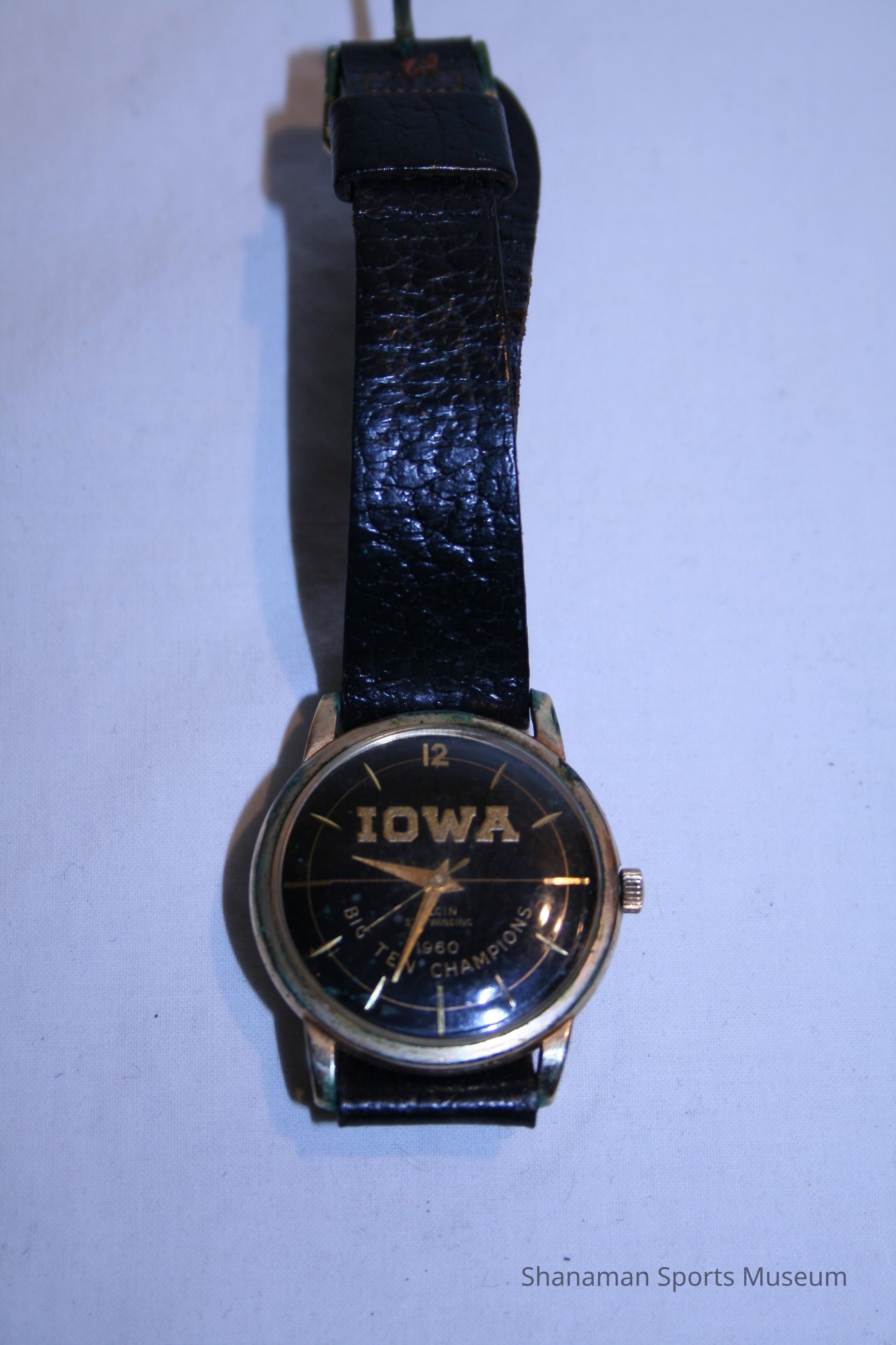 The 1960 Big Ten Championship watch has a black leather strap, gold frame, clasp and hands and has Williams’ name etched on the back.