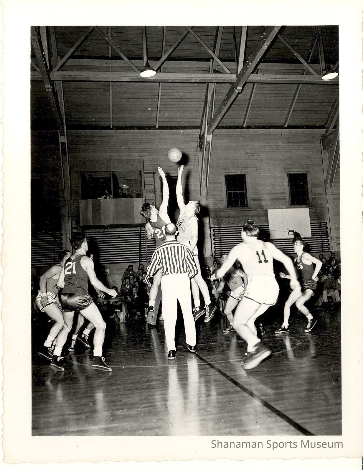 A preliminary description of the photo had placed it in the 1950s. The uniforms, however, look more like those of the late ’40s, including the ubiquity of black sneakers in this shot. White sneakers rapidly became favored in the 1950s. In addition, after the completion of CPS’s Memorial Fieldhouse in the spring of 1949, it appears that most, if not all, intercollegiate competition on campus was held in the newer venue, leaving the Warner Gym to intramural sports.Made/Created