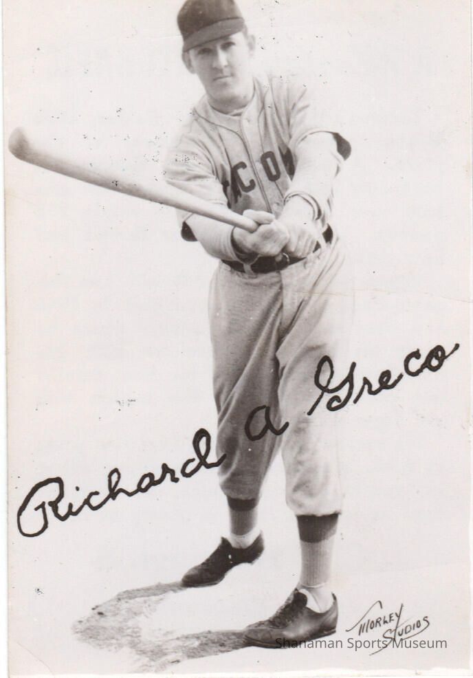 Autographed, black-and-white photo of Dick Greco while he played outfield for the Tacoma Tigers. Greco was one of the best home run hitters for Tacoma as he belted 126 homers for the Tigers from 1946 to 1950. From 1946 to 1957, the 6-foot-3, 215-pound Greco smacked 333 home runs in the minor leagues, giving him an average of 33 homers a season. Greco, who graduated from Tacoma's Stadium High School in 1943, had a sensational season in 1950 for the Tacoma Tigers when he led the Western International League in hits (203), total bases (363), home runs (36) and RBI (154). When he was a player-manager for Modesto in the California League in 1956, Greco hit 44 home runs and drove in 162 runs. His career batting average was .327. Despite his sensational stats, Greco, a strong-armed outfielder, didn't make it to the major leagues.Lexicon