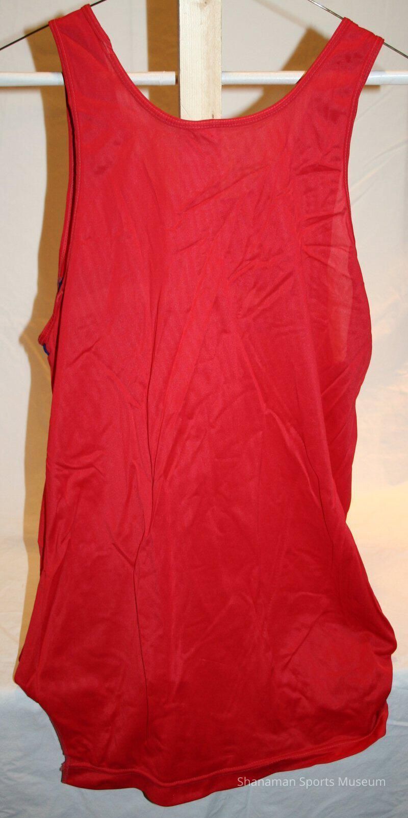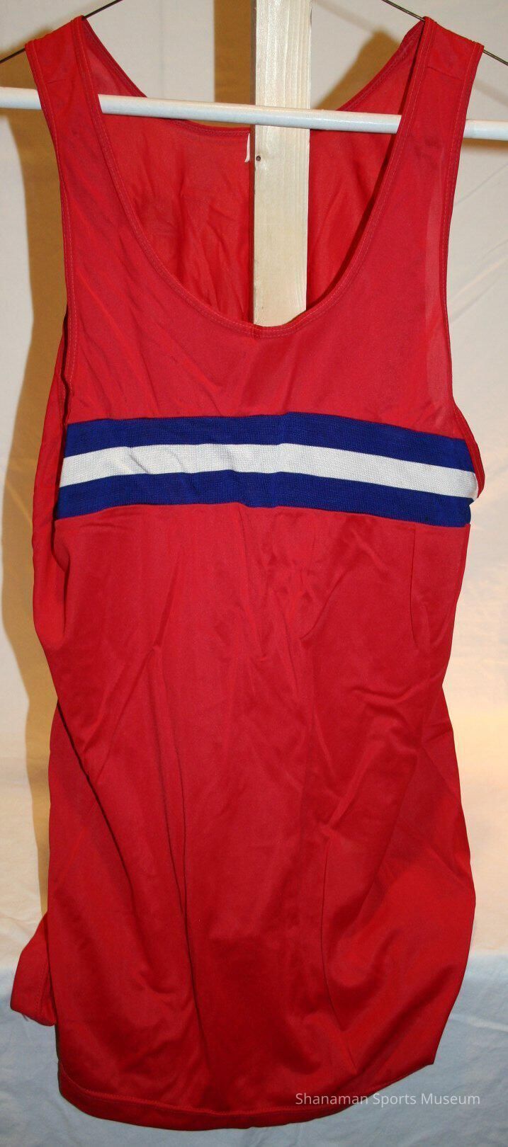 This red track and field jersey was worn by Dana LeDuc while at Washington High School when he won the 1971 shot-put title. LeDuc went on to win the Southwest Conference championship in the shot put in 1974, 1975 and 1976 while at the University of Texas and earned All-America honors. He also won the 1976 National Championship in the shot put. LeDuc stayed at his alma mater and was named Texas’ first strength and conditioning coach in 1978. He also served as strength and conditioning coach for the Seattle Seahawks and the St. Louis Rams.