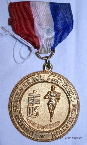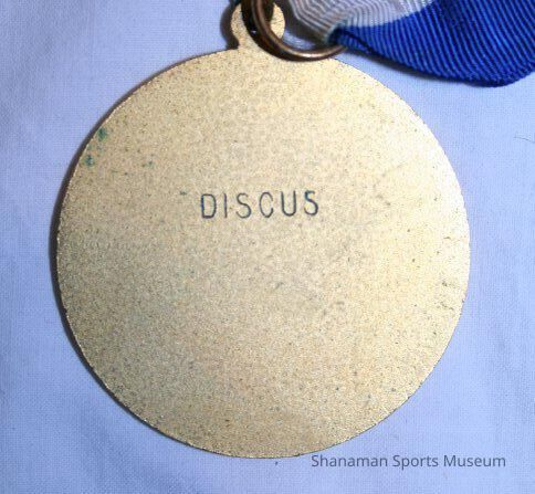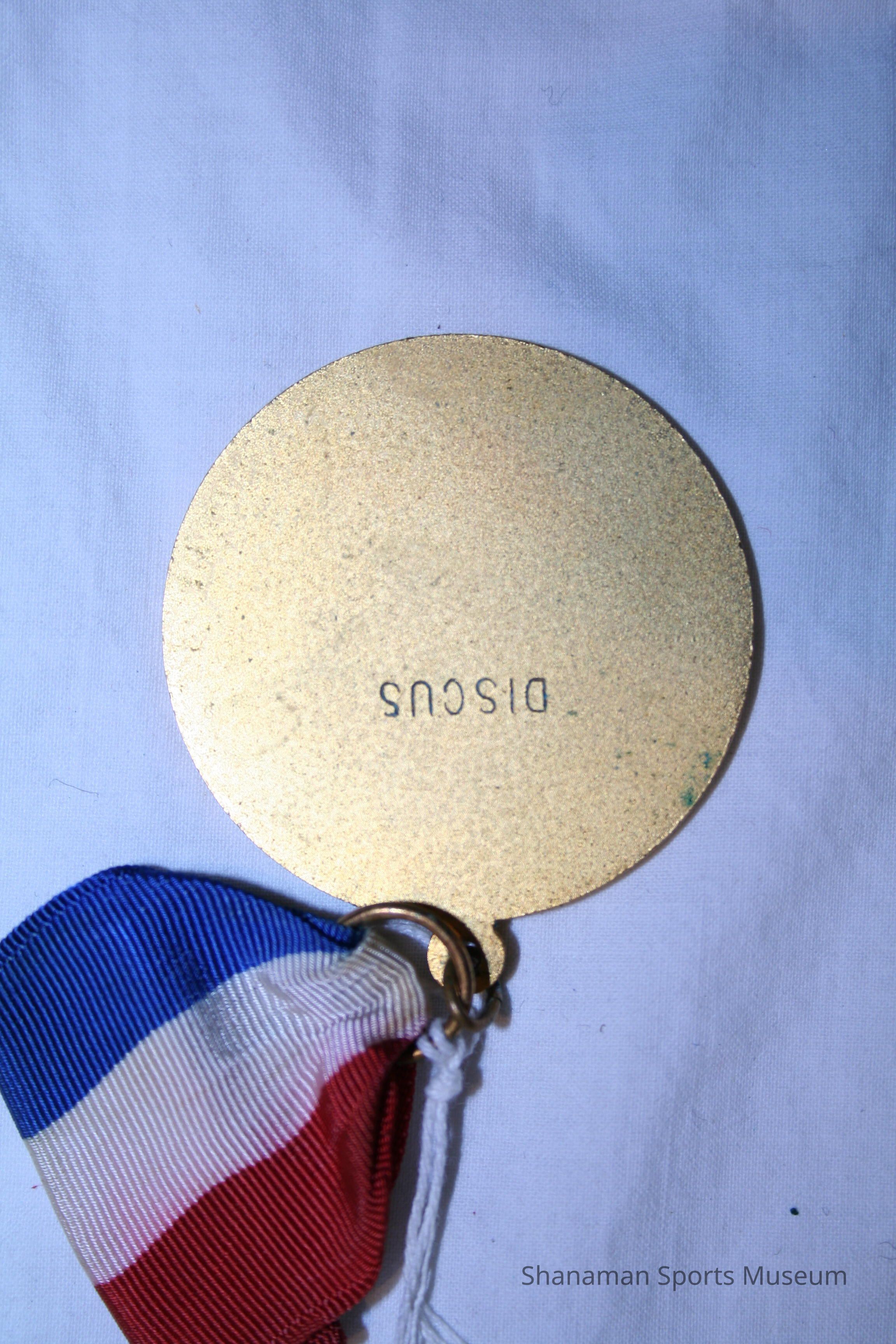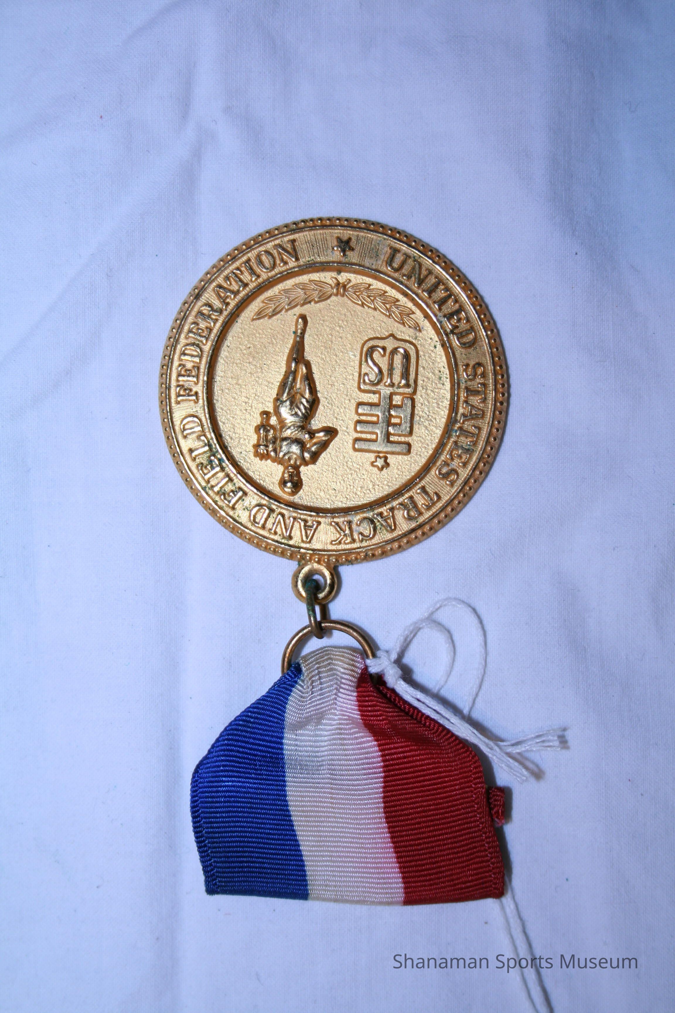 This medal and pin was earned by Dana LeDuc in the discus by the United States Track & Field Federation. LeDuc, a Washington High School standout who won the 1971 state title in the shot put. LeDuc went on to win the Southwest Conference championship in the shot put in 1974, 1975 and 1976 while at the University of Texas and earned All-America honors. He also won the 1976 National Championship in the shot put. LeDuc stayed at his alma mater and was named Texas’ first strength and conditioning coach in 1978. He also served as strength and conditioning coach for the Seattle Seahawks and the St. Louis Rams.