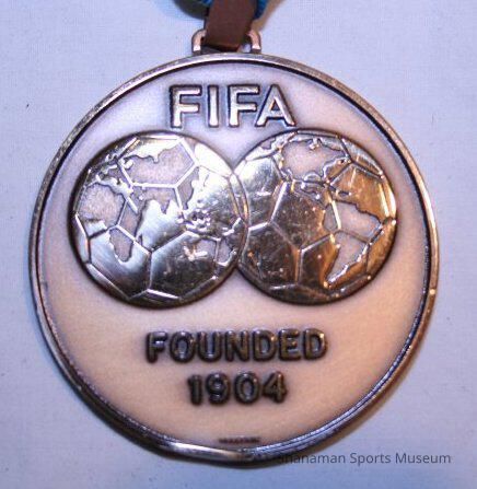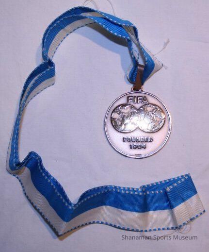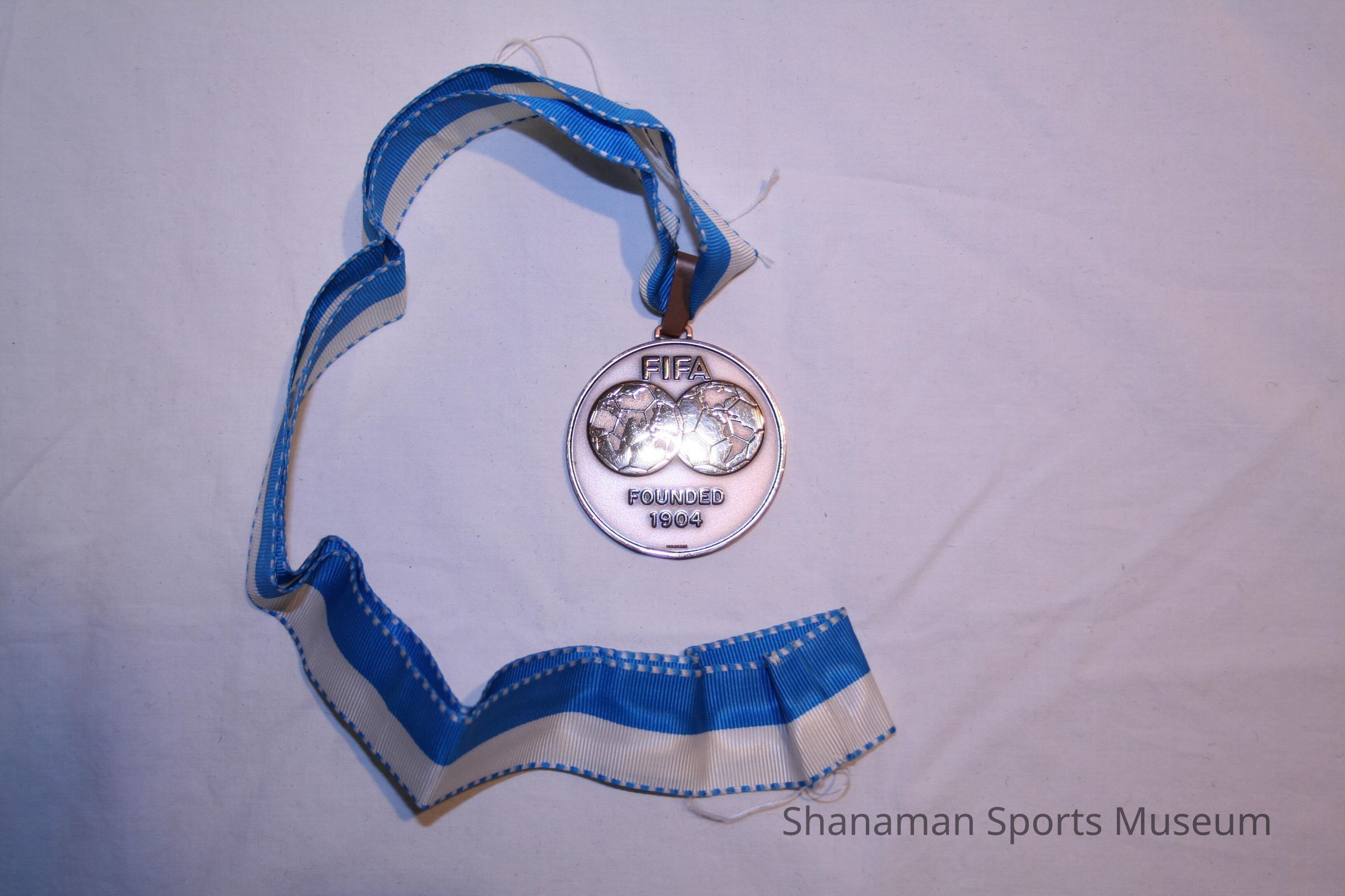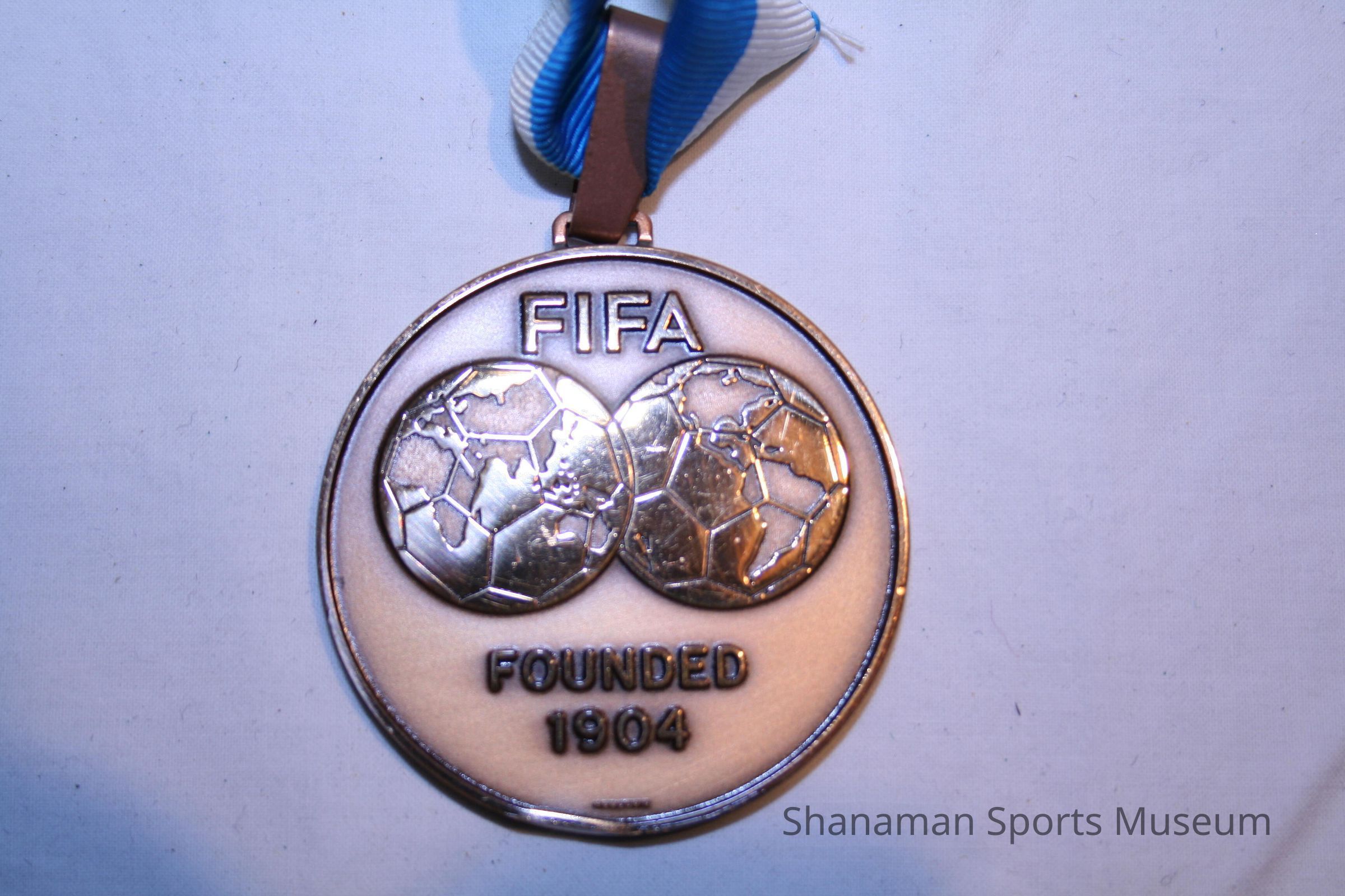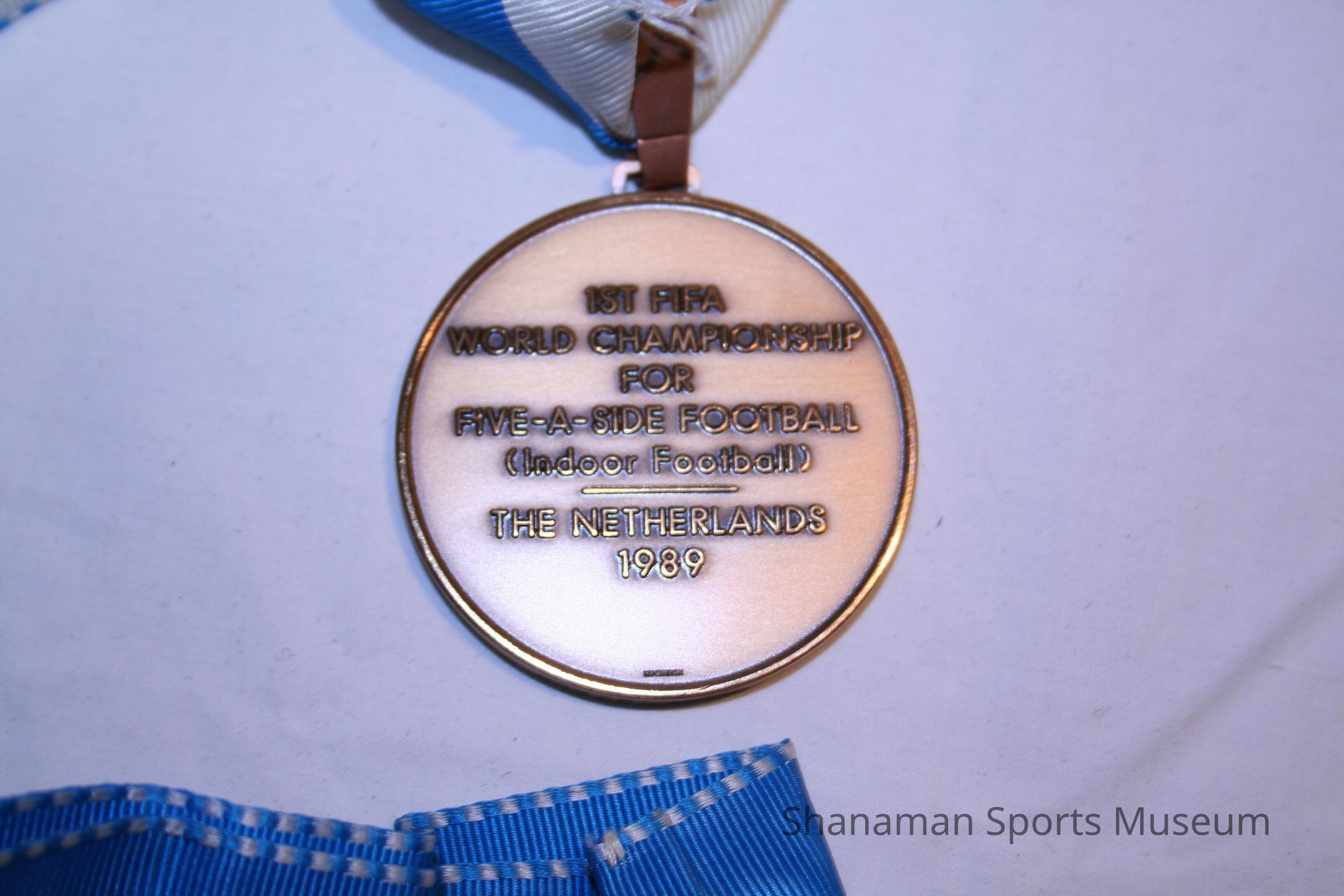 The bronze medal with a blue and white ribbon is has "FIFA Founded 1904" on one side, "1st FIFA World Championship for Five-a-side Football (Indoor Football) The Netherlands 1989" on the other.