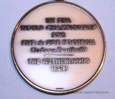 This is a third-place medal presented for the 1989 inaugural FIFA Futsal World Championships in the Netherlands. The tournament featured 16 teams, with Brazil winning the gold medal, Netherlands the silver and the United States the bronze.