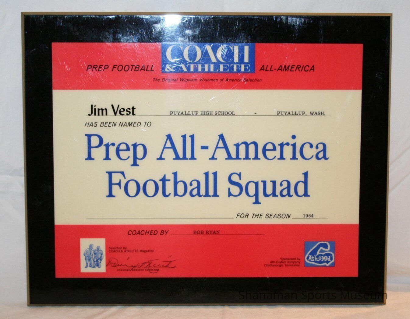 A plaque honors Puyallup High School’s Jim Vest, who in 1964 became the second football player from the state of Washington to be named to the Parade Magazine All-American team.