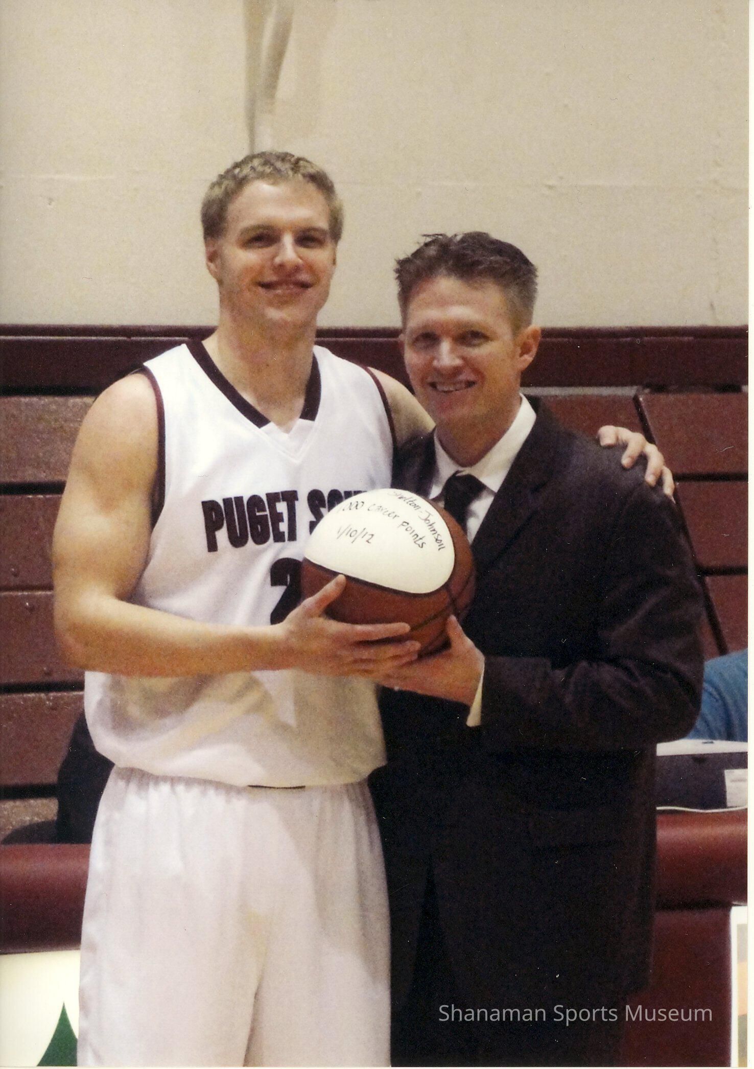 Kaleb Shelton-Johnson, left, posing with coach Justin Lunt, right, after Shelton-Johnson scored his 1,000 career point with the University of Puget Sound. Shelton-Johnson was named the Dick Hannula Male Athlete of the Year in 2012 for his accomplishment. Shelton-Johnson graduated from Tacoma's School Arts as a talented pianist.Lexicon