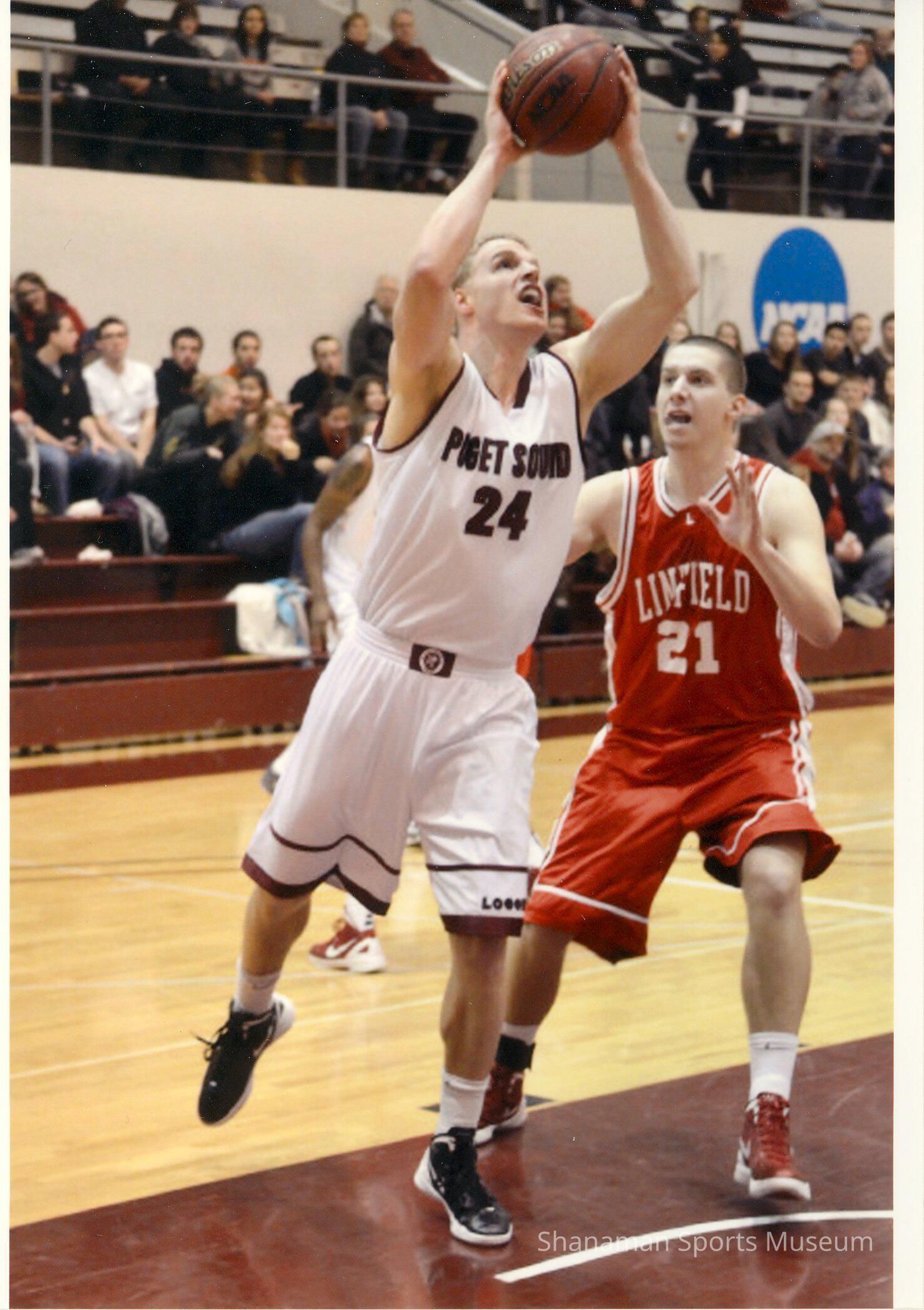 Photograph- color, of Kaleb Shelton-Johnson #24 while playing backetball for the University of Puget Sound. Shelton-Johnson graduated from Tacoma's School for the Arts as a talented pianist and played basketball while attending the University of Puget Sound.Lexicon