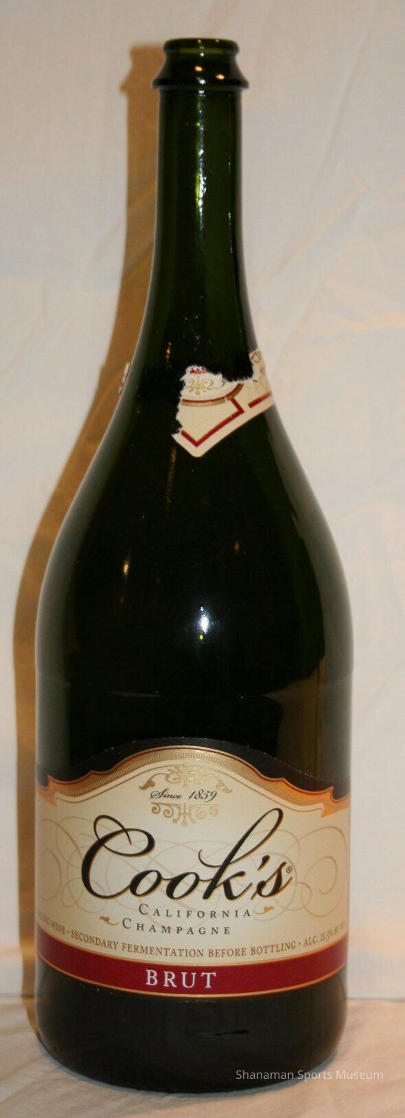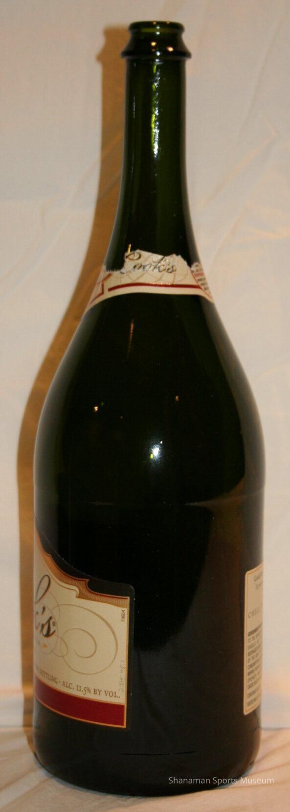 This Cook's champagne bottle was donated by the Tacoma Rainers. They celebrated when they became the Tacoma Rainiers in 1995 when they began their affiliation with the Seattle Mariners and that connection remains today. Since that affiliation began, most of the Seattle Mariners talent has passed through Tacoma. The prospects who turned to stars include Alex Rodriguez, Raul Ibanez, Felix Hernandez, J.J. Putz, Kyle Seager and more. Tacoma has maintained that affiliation with the Mariners, but before that it changed frequently. From 1960 to 1965 they were the Tacoma Giants, then from 1966 to 1971 they were the Tacoma Cubs, then from 1972 to 1977 they were the Tacoma Twins, then in 1978 they were the Tacoma Yankees, then in 1979 they were the Tacoma Tugs, then from1980 to 1994 they were the Tacoma Tigers.