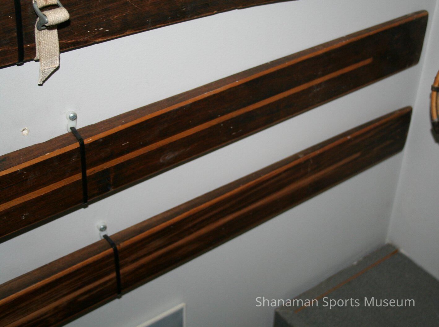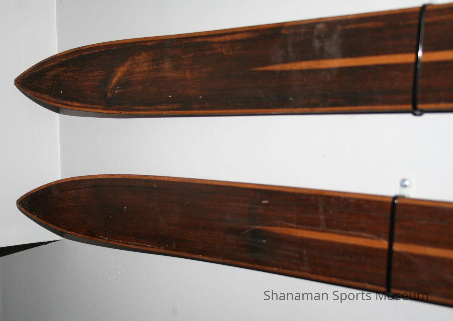 A pair of wooden skis made by Tacoma ski jumper Sigurd Johnson in 1915. Johnson competed and often won ski jumping competitions at Mount Rainier staged by the Northwest Ski Club. In 1918 he won with jumps of 67 and 68 feet. In 1919, as Goldwyn Studios shot footage for the film “Silver Horde,” he went farther (95 and 100 feet) to win again. He failed to win in 1920, but won in ‘21 with a jump of 126 feet.Lexicon