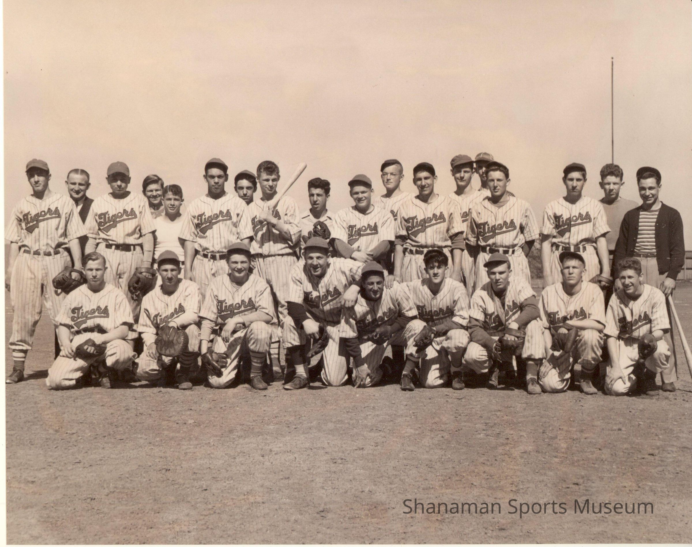 The 1943 Stadium High School baseball team, featuring Dick Greco, kneeling center, pose for a team photo.