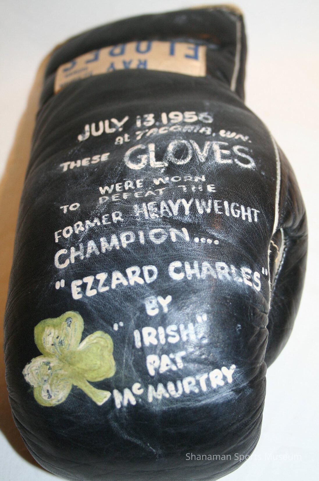 These black leather boxing gloves were worn by “Irish” Pat McMurtry when he beat former heavyweight champion Ezzard Charles on July 13, 1956 in Tacoma. McMurtry was one of the area’s biggest stars in the Pacific Northwest, a boxer who was homegrown, a legitimate title contender and potential heavyweight champion. McMurtry won the NCAA heavyweight title in 1954, was ranked fifth among the world’s heavyweight. One of his biggest career highlights was a decision over George Chuvalo at Madison Square Garden in 1958, in which he wore these boxing shorts. McMurtry, who had a career record of 33-4-1, was inducted into the Washington State Sports Hall of Fame and the Tacoma-Pierce County Sports Hall of Fame.