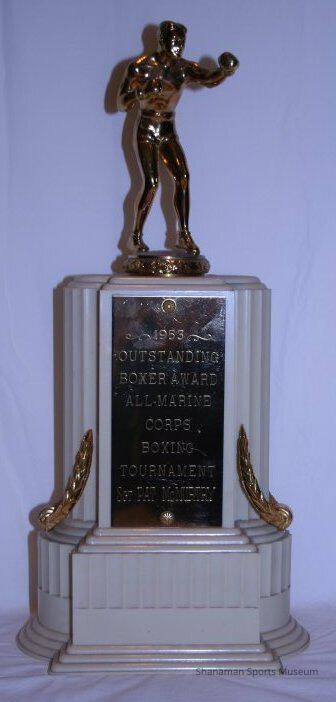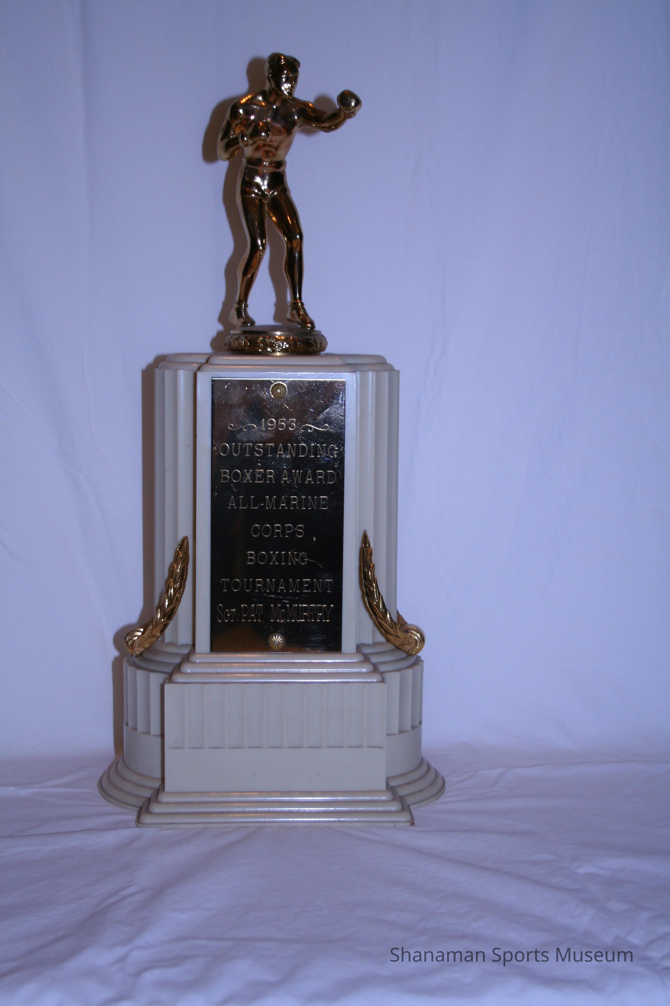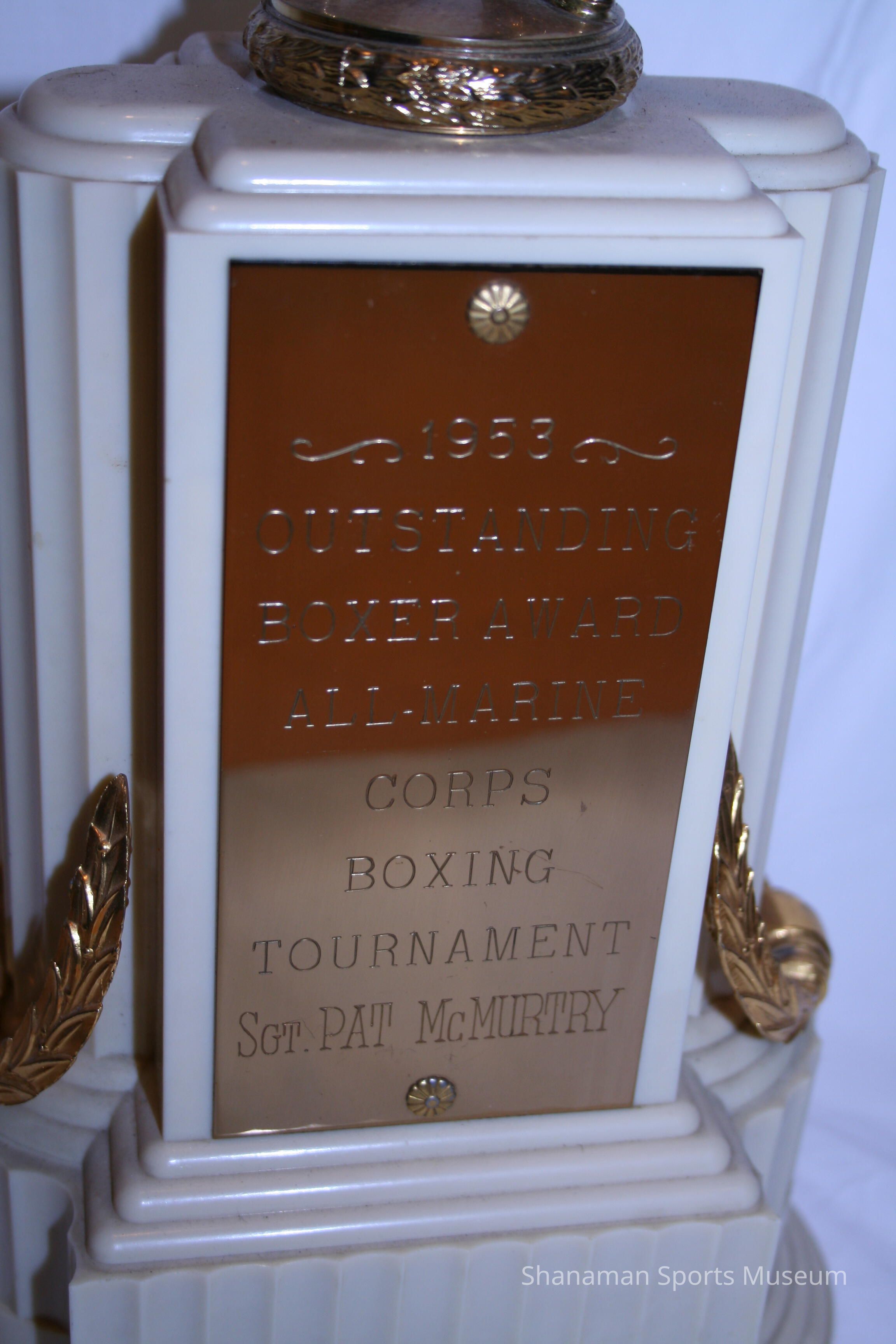 “Irish” Pat McMurtry won the 1953 Outstanding Boxer Award for the All-Marine Corps Boxing Tournament. McMurtry, a Tacoma native, was one of the area’s biggest stars in the Pacific Northwest, a boxer who was homegrown, a legitimate title contender and potential heavyweight champion. McMurtry won the NCAA heavyweight title in 1954, was ranked fifth among the world’s heavyweight. One of his biggest career highlights was a decision over George Chuvalo at Madison Square Garden in 1958, in which he wore these boxing shorts. McMurtry, who had a career record of 33-4-1, was inducted into the Washington State Sports Hall of Fame and the Tacoma-Pierce County Sports Hall of Fame.
