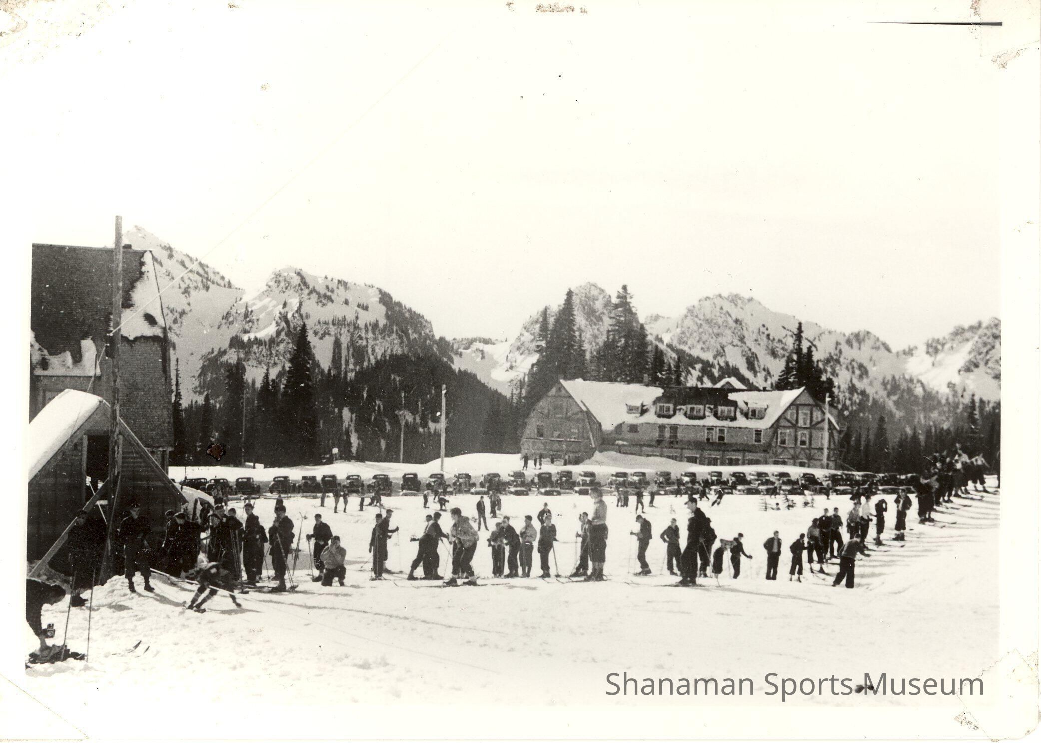 With Paradise Inn seen in the background, a big group of skiers wait in line to take a ski lift in this black-and-white photo taken in 1938. The parking lot was full of cars on this day. Paradise Lodge was built in 1916 on the slopes of Mount Rainier at 5,400 feet and opened in 1917. In 1936, a ski rope tow was installed at Paradise, making it a popular destination for skiers. A T-Bar ski lift was approved to be built in 1933 during the depression, but it was never built.Made/Created
