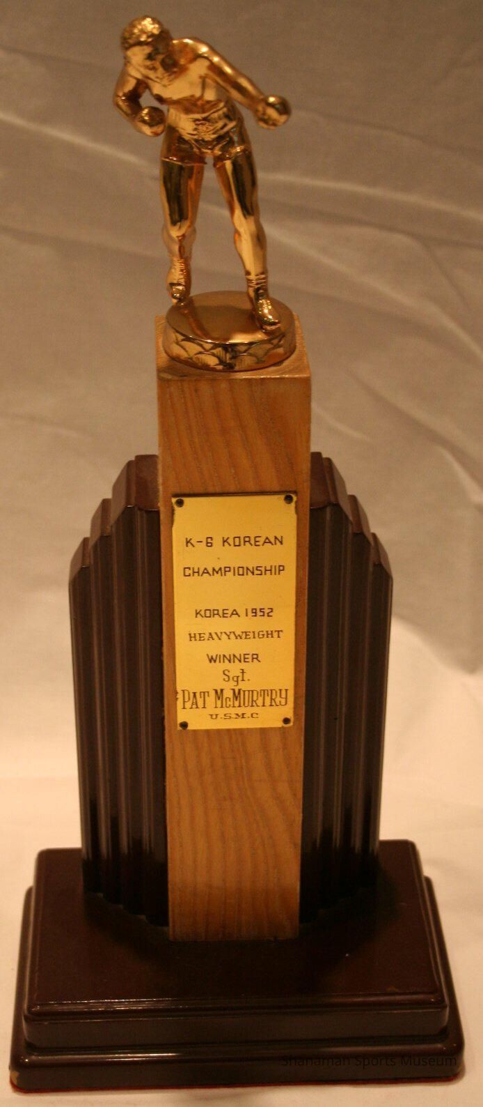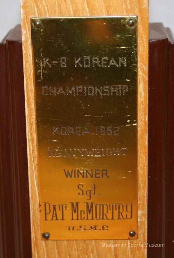 “Irish” Pat McMurtry won the Korean Championship heavyweight title in 1952. McMurtry, a Tacoma native, was one of the area’s biggest stars in the Pacific Northwest, a boxer who was homegrown, a legitimate title contender and potential heavyweight champion. McMurtry won the NCAA heavyweight title in 1954, was ranked fifth among the world’s heavyweight. One of his biggest career highlights was a decision over George Chuvalo at Madison Square Garden in 1958, in which he wore these boxing shorts. McMurtry, who had a career record of 33-4-1, was inducted into the Washington State Sports Hall of Fame and the Tacoma-Pierce County Sports Hall of Fame.