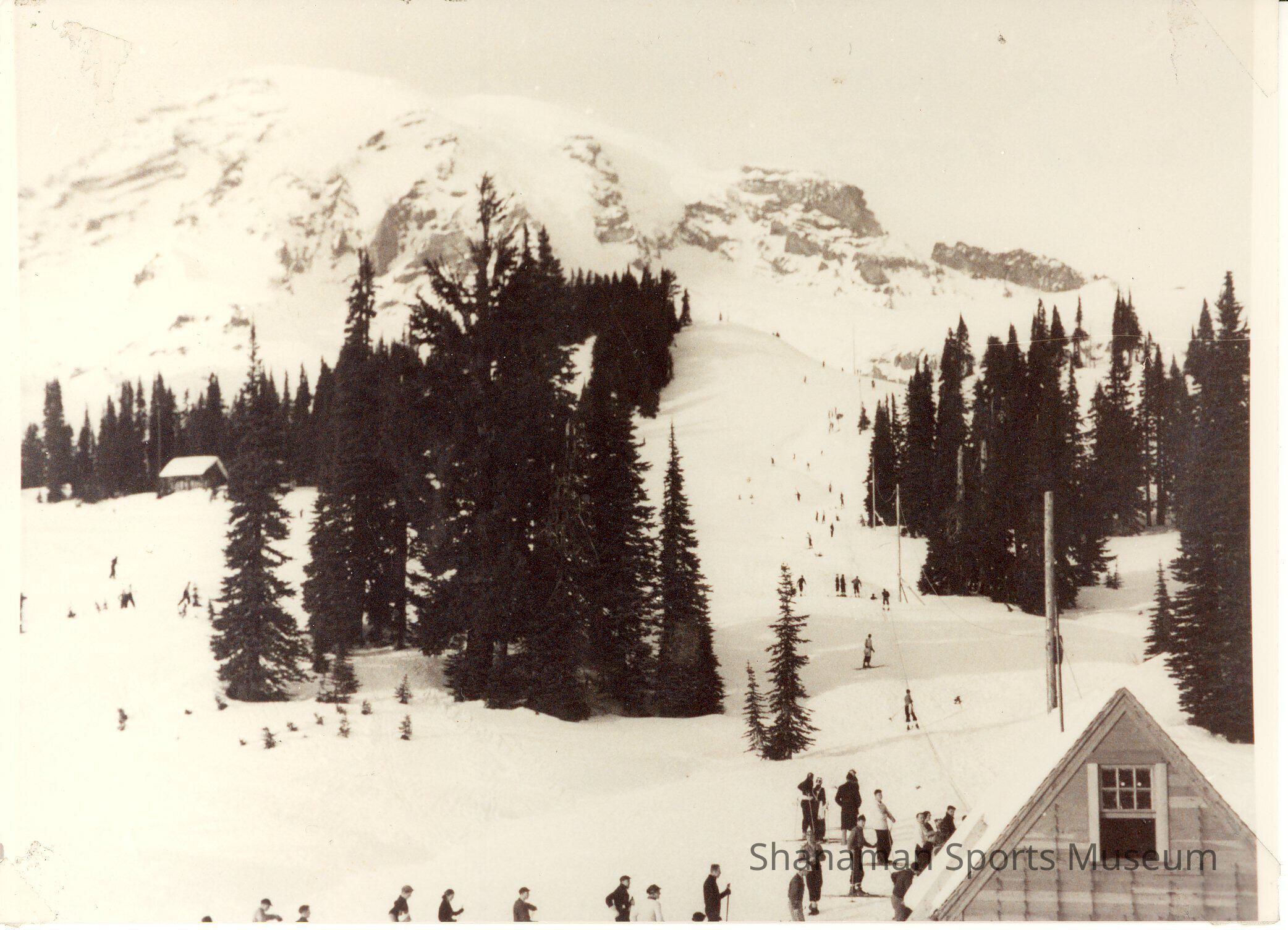Many skiers wait in line to be taken up the snowy slopes with a rope tow at Alta Vista at Paradise on Mount Rainier in this photo taken in the late 1930s. A rope tow was installed at Paradise in 1937. Pioneer Rainier skier Olive Rand first took to the slopes at Paradise in 1911, beginning years of skiing there for him. In 1935, the U.S. Olympic downhill ski team held their tryouts at Paradise. In 1940, a T-bar tow service was built at the Paradise slopes. At 5,400 feet, Paradise averages 641 inches of snow a year. When the snow is melted, Paradise and surrounding trails offer popular hikes during the summer.Made/Created