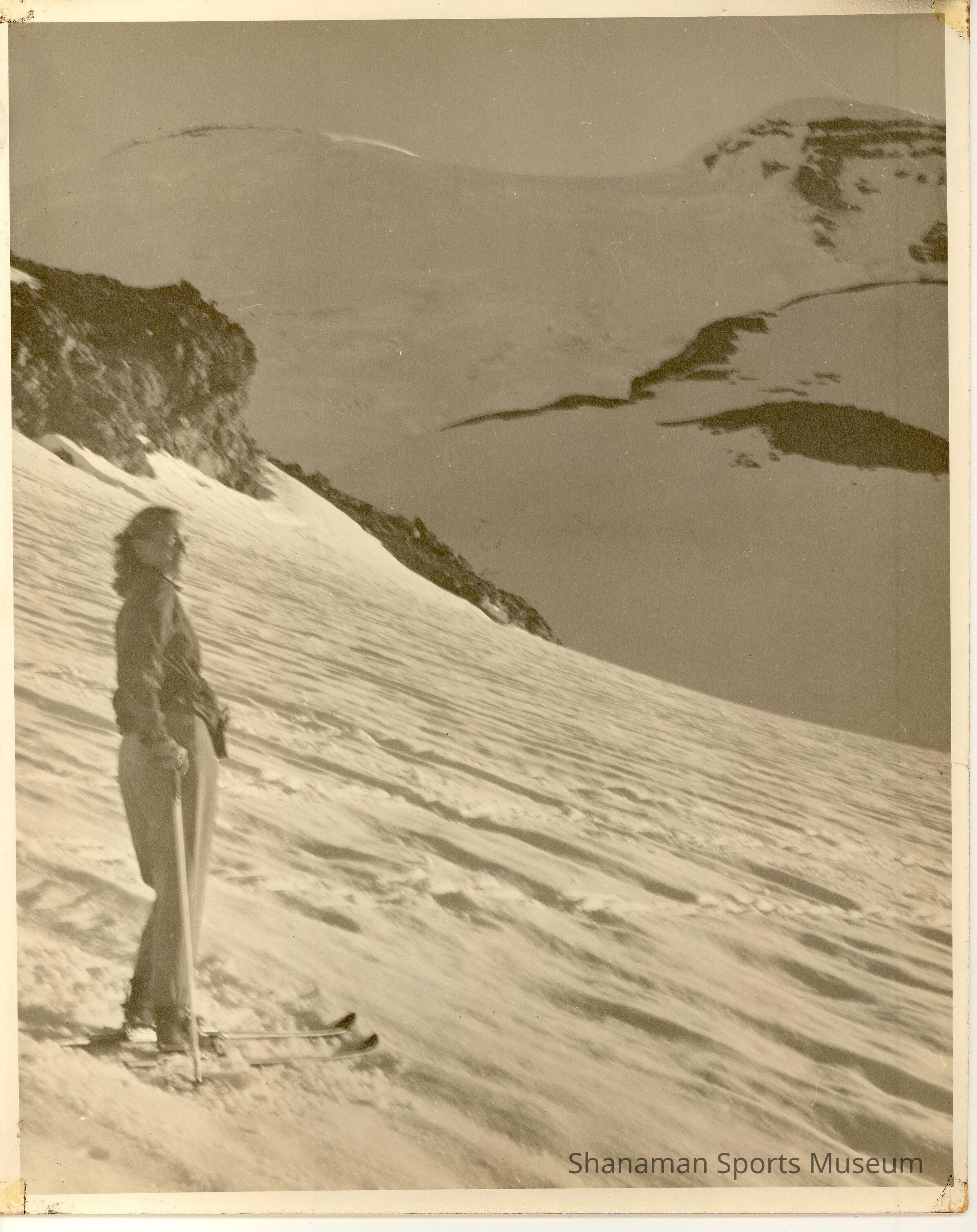 Standing on her skies, Jane Creswell Howe looks down the snowy slopes at Interglacier on Mount Rainier in this black-and-white photo taken in the 1940s. Howe was an avid skier and a frequent skier at Mount Tahoma. The photo was donated by Chuck Howe. The Interglacier is a small glacier on the northeast face of Mount Rainier. The glacier is on a wedge called the Steamboat Prow and is between the Emmons Glacier on the south and the Winthrop Glacier to the north. The glacier lies just below Steamboat Prow at about 9,400 feet. Paradise averages 641 inches of snow a year, making it a popular place for crosscountry skiers, snow boarders and snowshoers.Made/Created