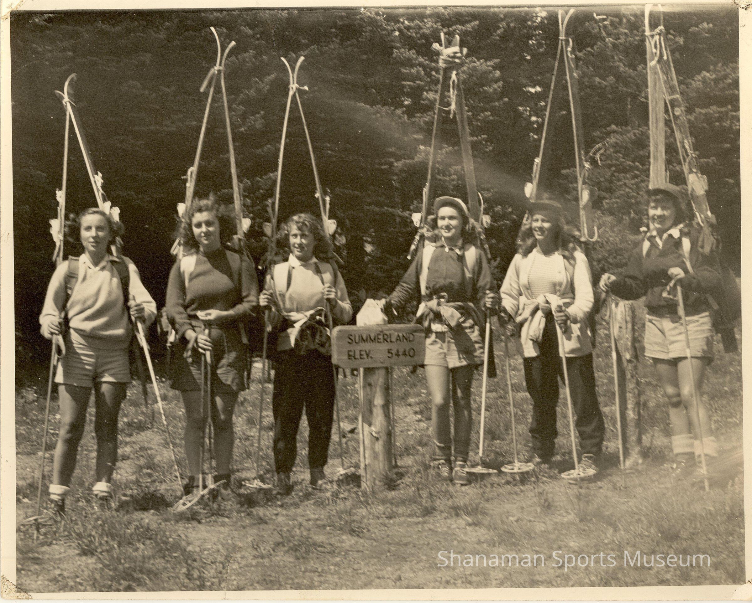 Six women holding ski poles with skis on their backs get ready to hike to Summerland on Mount Rainier in this black-and-white photo taken in the late 1940s or early 1950s. They had to hike hiker up on the mountain to get to the snow. Jane Creswell Howe, who was a frequent skier and hiker on the slopes at Mount Rainier, is the third from the right in this photo. Today, Summerland is one of the most popular hikes on Mount Rainier and is a camp along the Wonderland Trail, which is the 92-mile trail around Mount Rainier.Lexicon