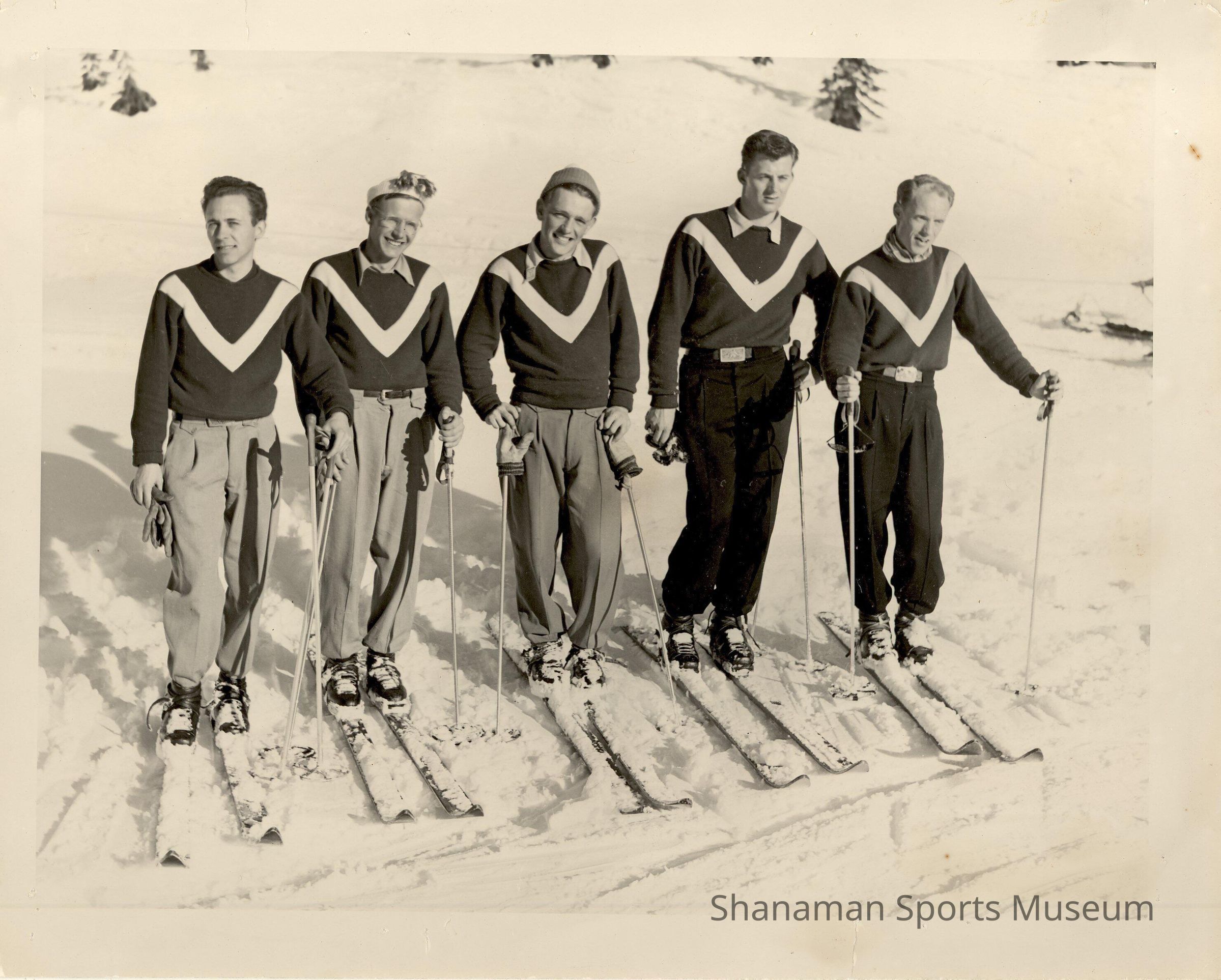 The 1950 ski team at the College of Puget Sound line up for a photo taken at Chinook-Cayuse Pass back in the spring of 1950. From left to the right, the skiers on the team were: Clint Gossard, John Boejel, Chuck Jorgenson, Weldon Howe and Chuck Howe, who were brothers. Cayuse Pass connects to Chinook Pass and White Pass on the east side of Mount Rainier. The Cayuse Pass summit is at 4,675 feet high and is at the junction of the state routes 123 and 410. Chinook and Cayuse passes provide skiers and hikers two scenic routes through the Cascade Mountain Range at Mount Rainier National Park. Chuck Howe donated this photo.