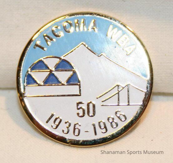 This is a pin believed to be in honor of the 50th anniversary for the Tacoma WBA (Women’s Bowling Association). The pin features renditions of the Tacoma Dome, the Narrows Bridge and Mount Rainier.