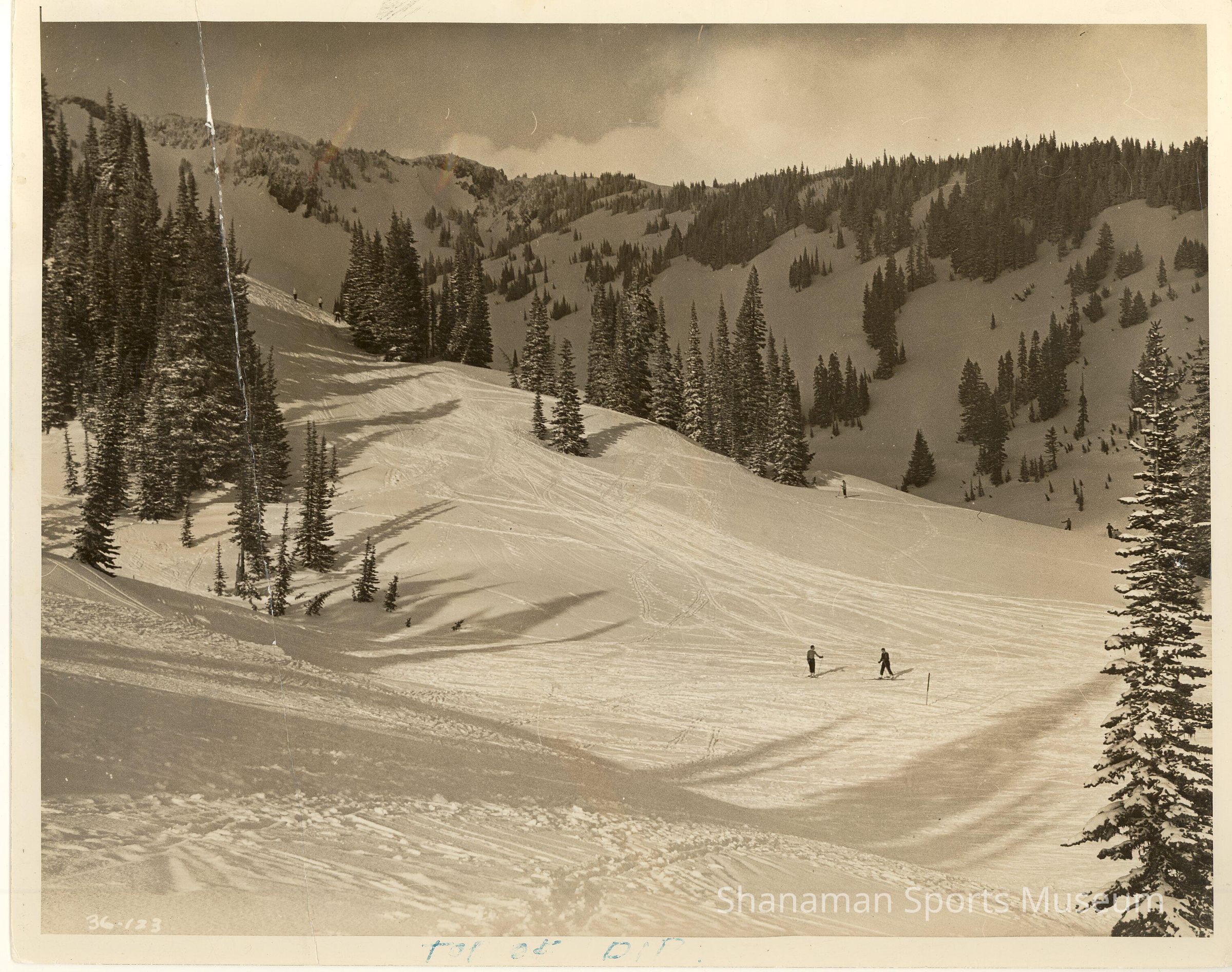 In this majestic, black-and-white photo taken in 1929, two skiers ski along at the bottom of Devil's Dip on the sides of Mount Rainier. Skiing has been a popular recreation on the snowy slopes of Mount Rainier, which is 14,440 feet and is the 17th tallest mountain in the United States. John Muir, a renowned conservationist, was among the people wanting to make Mount Rainier a national park back in the 1890s. A bill passed in congress in 1899 that made Mount Rainier the nation's fifth national park in the United States. To recognize Muir for his efforts, a campsite on the side of Mount Rainier at 10,000 was named after him. It is called Camp Muir and in the 1930s into the 1940s it was the starting point for a speedy ski race down to Paradise. Skiers reached speeds of 60 miles per hour.Made/Created