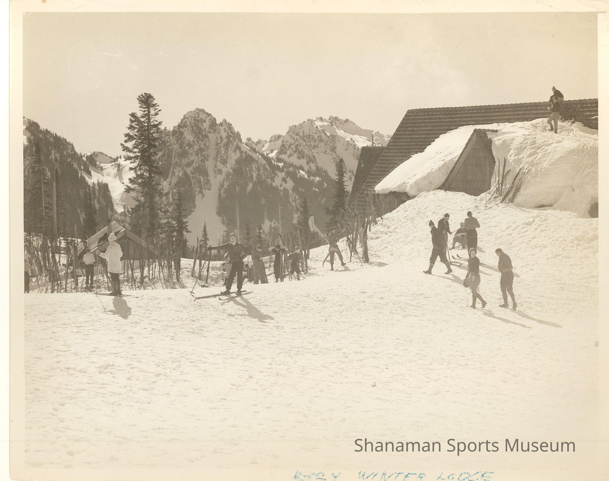 Skiers play in the snow on and around the lodge at Paradise in Mount Rainier National Park in 1929. Skiers started flocking to the area in the early 1900s to play in the snow. Paradise was home to America’s first ski school, founded by Otto Lang in 1936. The Tacoma Ski School, which taught thousands of people to ski, got its start at Paradise.Made/Created