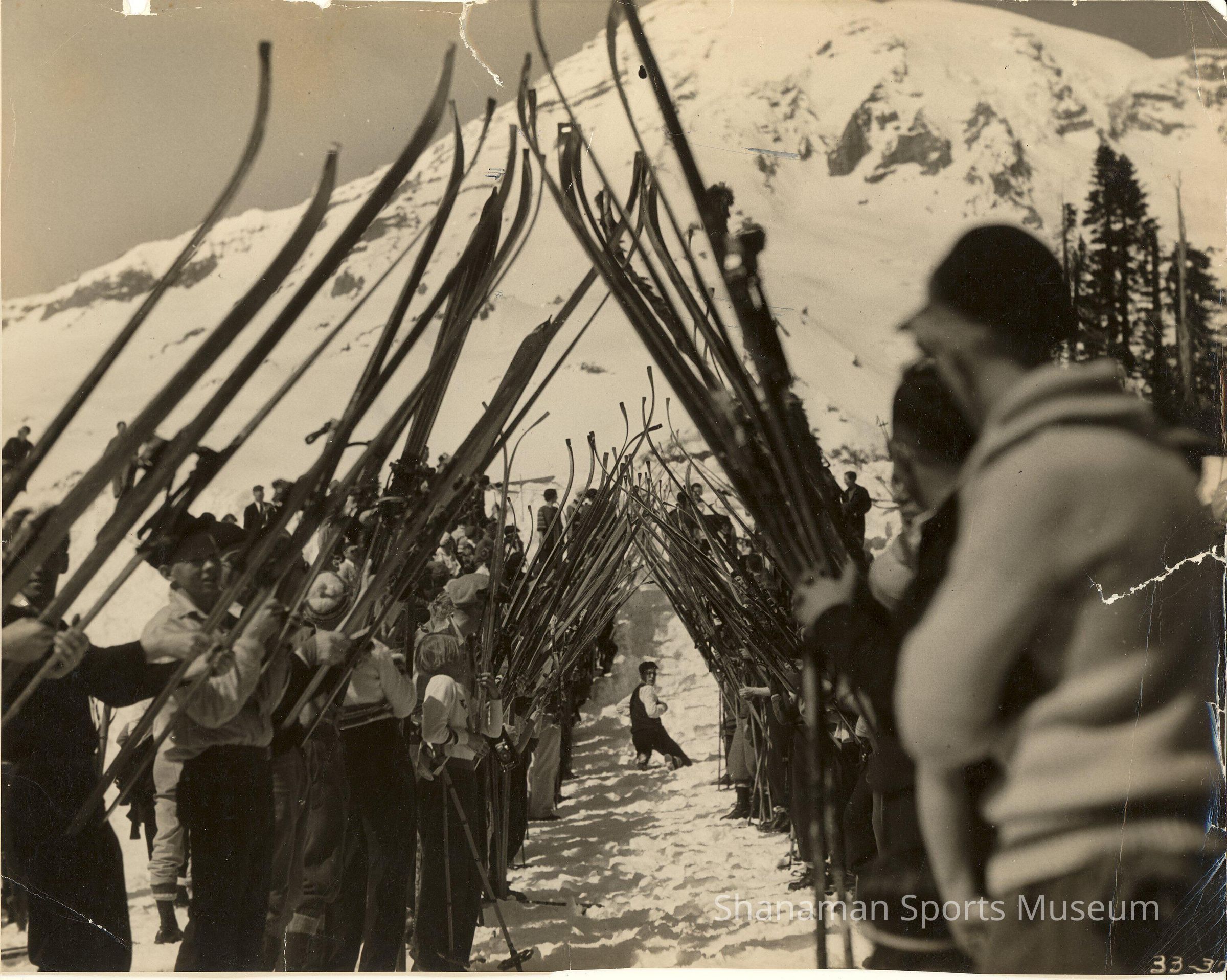 A skier kneels underneath a long row of skiers holding their skies up in some kind of ceremony held on the snowy slopes at Paradise back in 1929. When Paradise Inn opened on July 1, 1917, Paradise was already a popular place to go skiing. In 1936, a rope tow for skiers was installed at Paradise. Today Paradise Inn is a National Historic Landmark and is one of the great lodges on the west coast. There are miles of trails near Paradise that are used for cross-country skiing during the winter and for hikers during the summer. During the summer, the hillsides at Paradise turn from snow cover to being filled with meadows lush with wildflowers and it is very picturesque.Lexicon
