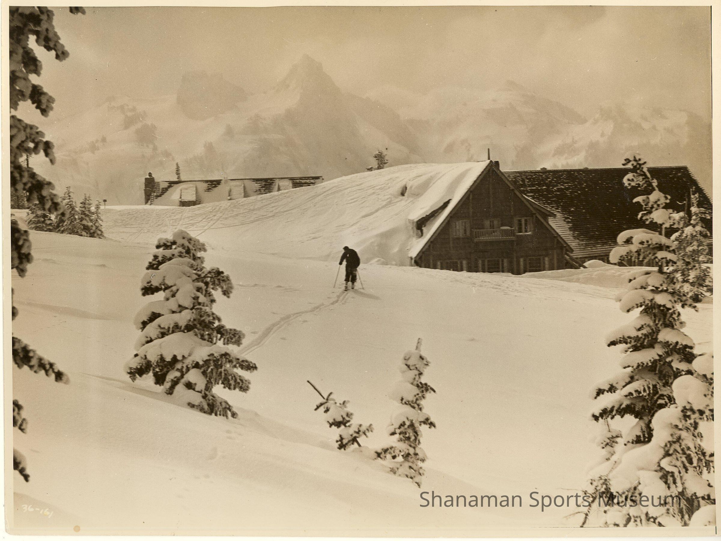 After a heavy snowfall at Mount Rainier, six men work at clearing the snow off the roof of Paradise Inn, digging and sawing away the snow in this photo taken in 1929. At 5,400 feet, Paradise averages 640 inches of snow a year. With lots of trail heads at Paradise, back country skiing is there for the thrill seeker that wants to test their skills outside of the confines of a ski resort. Mount Rainier, which at 14,400 feet is the 17th tallest mountain in the United States, offers a less traveled winter experience for board skiers and alpine skiers looking for fun. In 1936, a rope tow for skiers was installed at Paradise but that was eventually taken out in the late 1940s.Lexicon