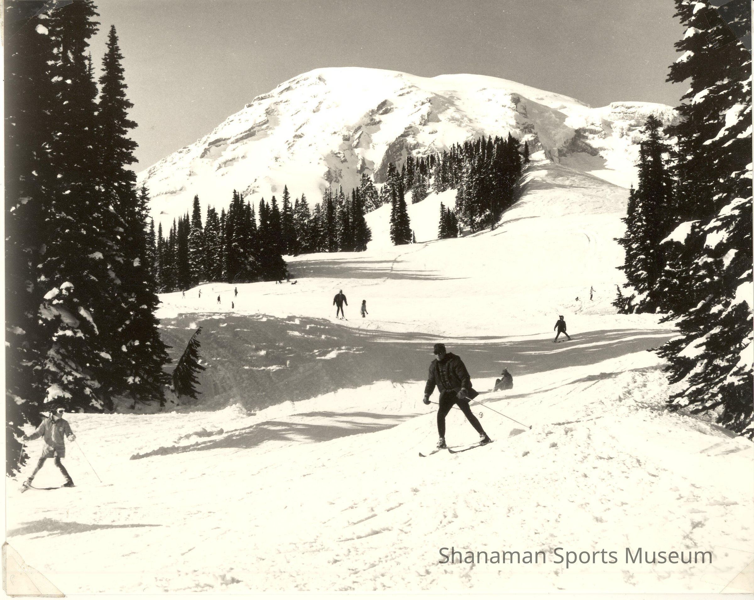 Several skiers ski down the slopes at Alta Vista on Paradise Valley at Mount Rainier back in 1936. Alta Vista Loop is one of the trails located at Paradise that is popular for its beautiful meadows of wildflowers during the summer and dramatic panoramic snowy views of Mount Rainier during the winter. Over the years, Mount Rainier has been a popular place for winter activities where people can downhill ski, cross country ski, snowshoe and tube. It's a snowy place. Paradise averages 645 inches of snow a year. In 1972, Mount Rainier set a world record for snowfall with 1,122 inches. During the summer when the snow melts off, Paradise becomes a beautiful flower covered slope, a perfect destination for hikers.Made/Created