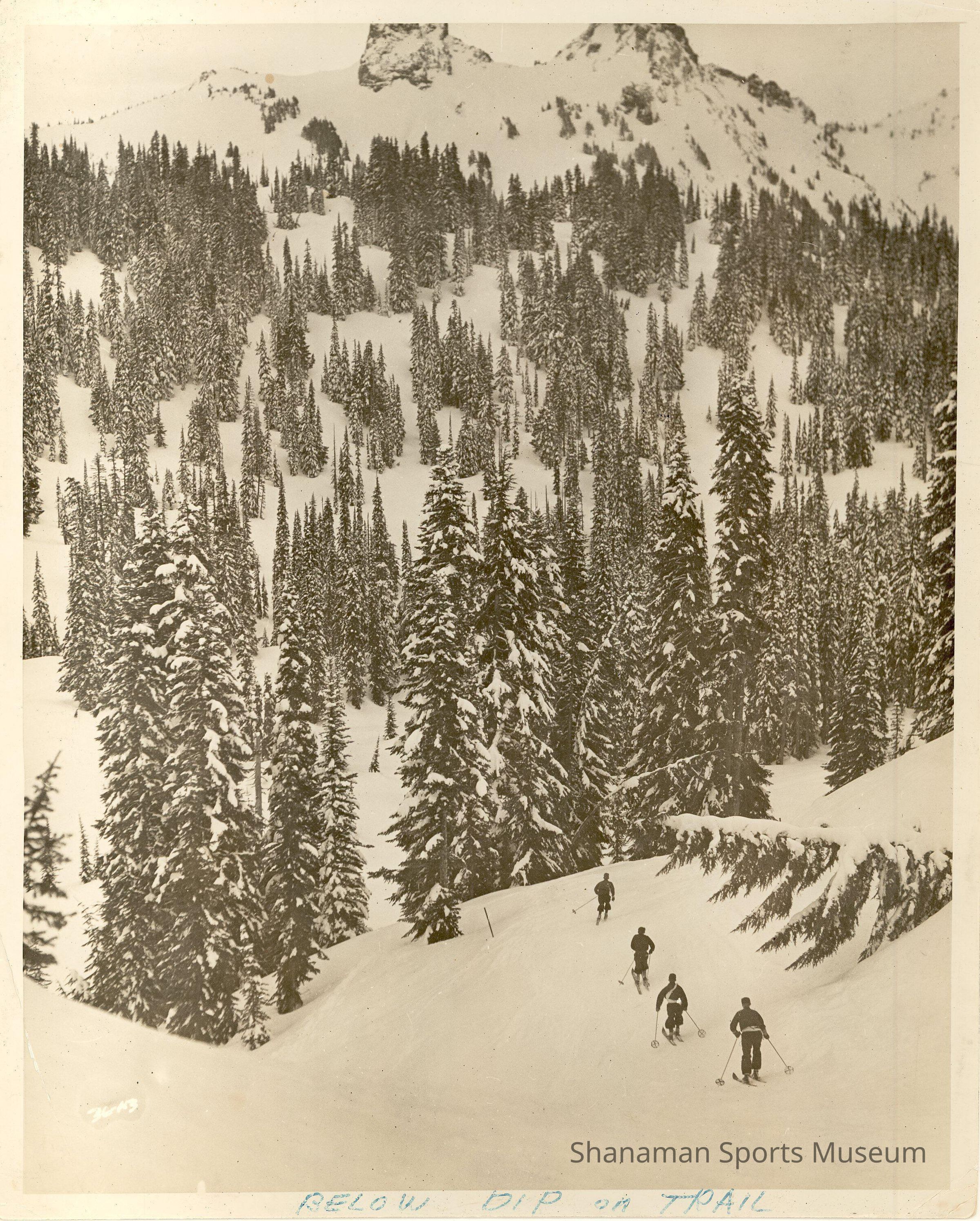 On a wintry day, four cross-country skiers ski through Devil's Dip on a trail from Paradise on Mount Rainier. Since the 1920s, skiing in the Paradise area has been a popular activity. Paradise Inn opened in 1917, giving skiers overnight stay and inviting more skiers to come. In 1938, a rope tow for skiers was built on the slopes at Paradise and that encouraged even more skiers to come and ski. Paradise is at 5,000 feet on the slopes of Mount Rainier, which is 14,440 feet. The road from the Nisqually entrance to Paradise is open year around, weather permitting. Paradise averages 121 days of snow and averages 670 inches of snow a year.Made/Created