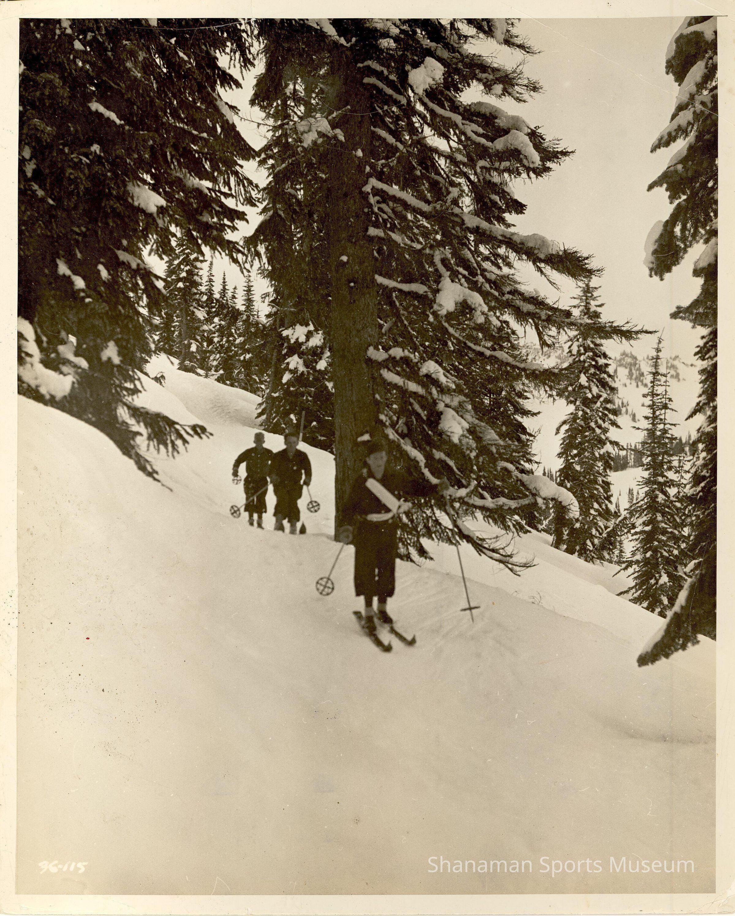 Three skiers ski down a trail cutting through the trees along Devil's Dip trail on Mount Rainier back in 1929. Since the 1920s, skiing has been a popular entertainment on Mount Rainier, which at 14,440 feet is the 17th tallest mountain in the United States. Skiers during the winter and hikers during the summer can go about five miles from Longmire to Devil's Dip, which is on the iconic Wonderland Trail that circles around Mount Rainier and goes 92 miles.Made/Created