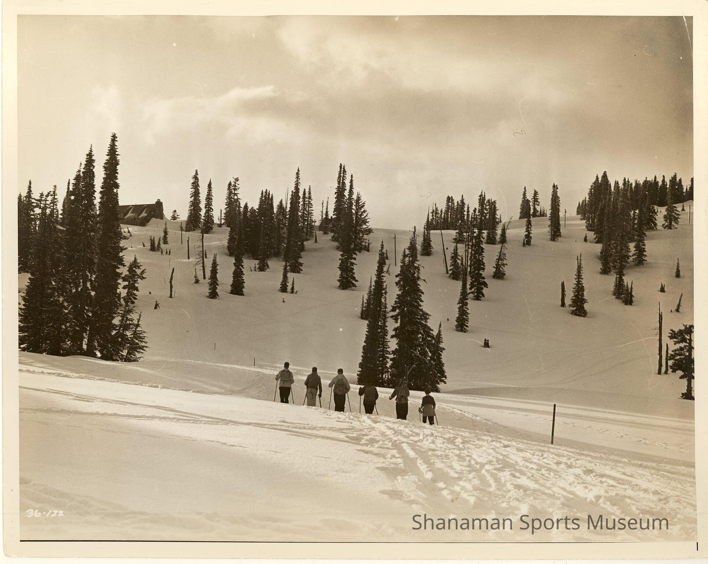 After a heavy snowfall at Mount Rainier, six men work at clearing the snow off the roof of Paradise Inn, digging and sawing away the snow in this photo taken in 1929. At 5,400 feet, Paradise averages 640 inches of snow a year. With lots of trail heads at Paradise, back country skiing is there for the thrill seeker that wants to test their skills outside of the confines of a ski resort. Mount Rainier, which at 14,400 feet is the 17th tallest mountain in the United States, offers a less traveled winter experience for board skiers and alpine skiers looking for fun. In 1936, a rope tow for skiers was installed at Paradise but that was eventually taken out in the late 1940s.Lexicon