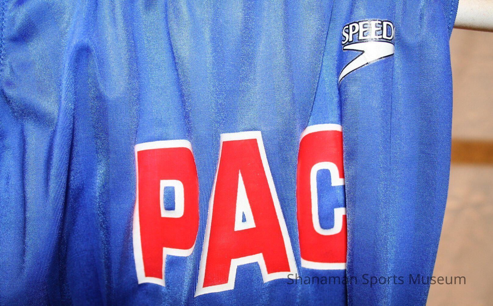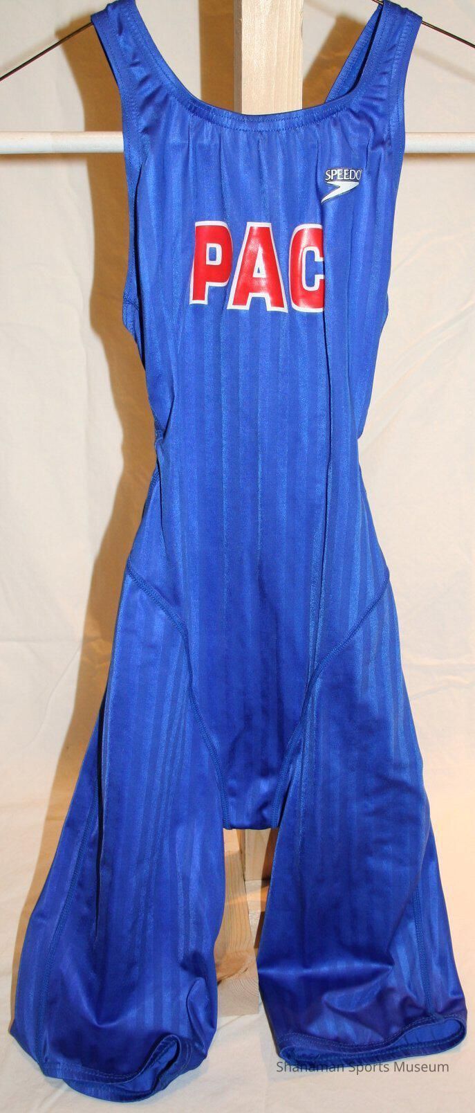 Swimsuit- worn by Jamie Reid while swimming for the Puyallup Aquatic Club. Suit is a blue Speedo with PAC on front.