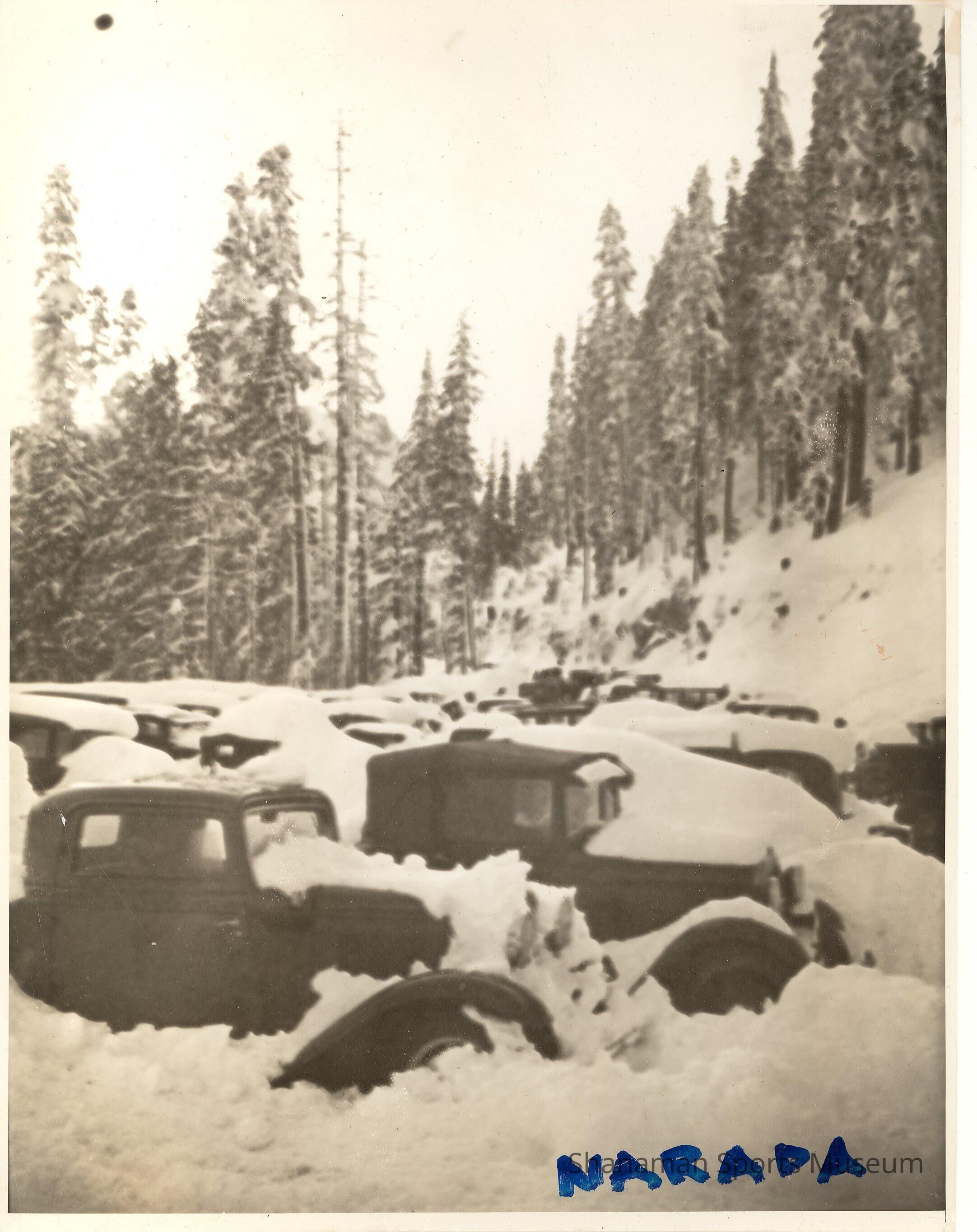 Snow covers cars in the Narada Falls parking lot in Mount Rainier National Park in 1935 or ‘36. Located below Paradise, skiers parked at Narada Falls and skied or hiked to Paradise before 1940. In 1940, the park service started opened the road all the way to Paradise for several winters. While the snow is plowed regularly today, many visitors still launch their winter outings from Narada Falls.Made/Created