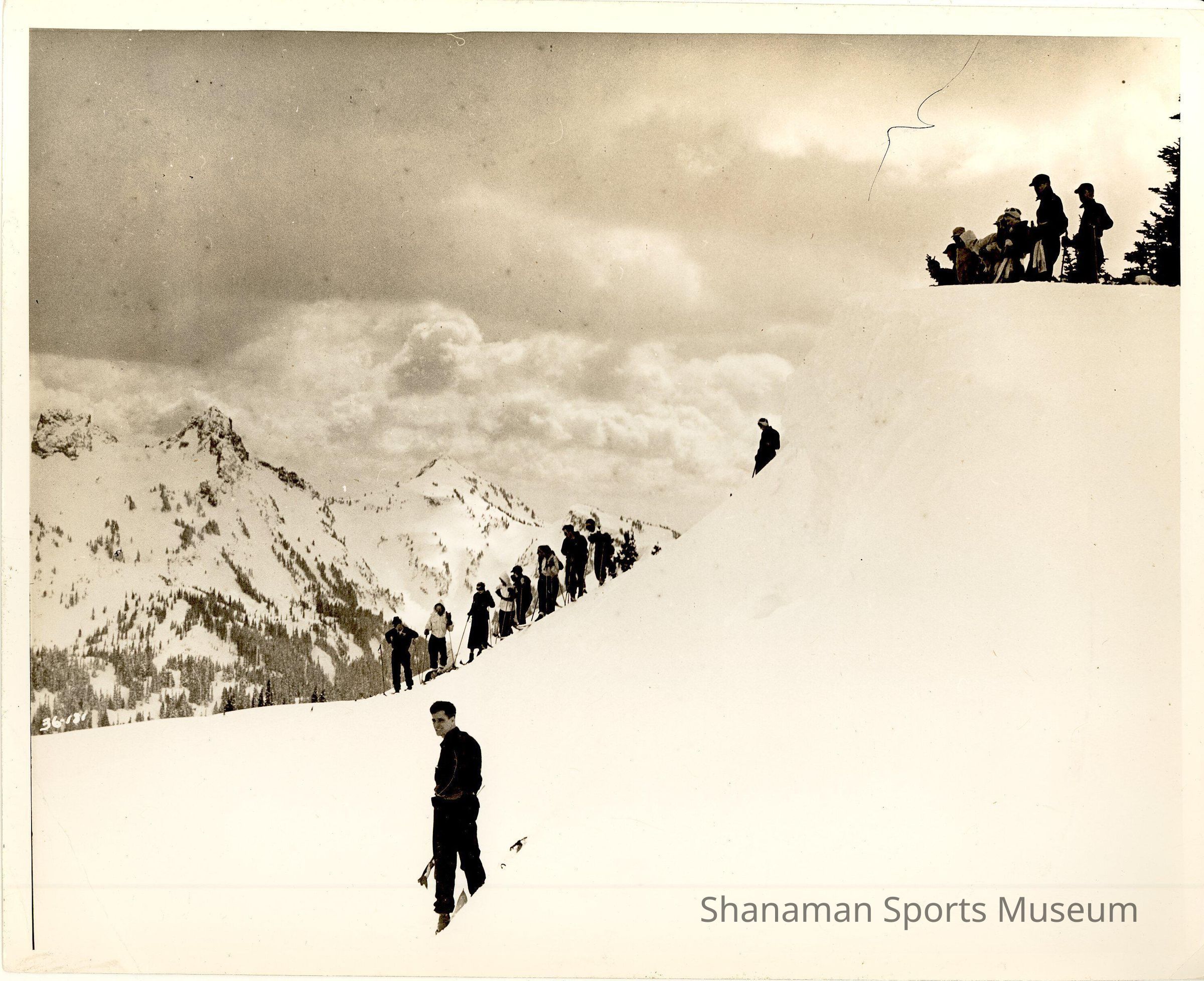 Skiers find spots to watch a race on Alta Vista at Mount Rainier National Park in the mid 1930s. In 1935, Paradise hosted the U.S. National Championship, an event that determined the team for the 1936 Olympics. “These tryouts were especially significant because 1936 was the first Olympics to include alpine skiing,” skiing historian Lowell Skoog told The News Tribune. “So this was the very first Olympic alpine skiing team that the U.S. ever selected.”Made/Created