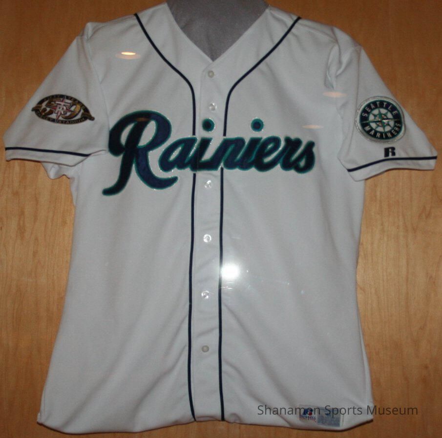 Tacoma Rainiers white baseball jersey from Eric Hull of the 2009 team. The jersey has a 50th anniversary patch on the right sleeve.
