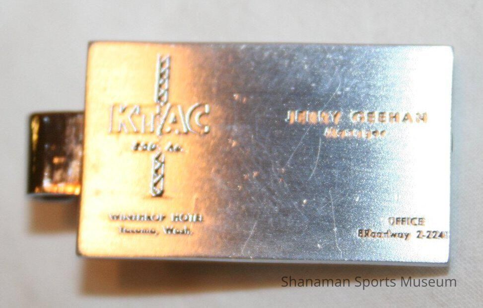 The tie clip reads, "KTAC Jerry Geehan Manager Winthrop Hotel Tacoma, Wash. Office Broadway 2-224"