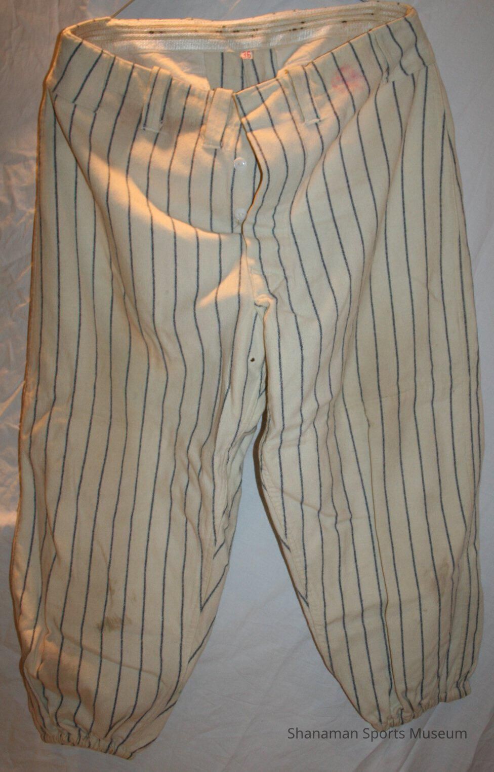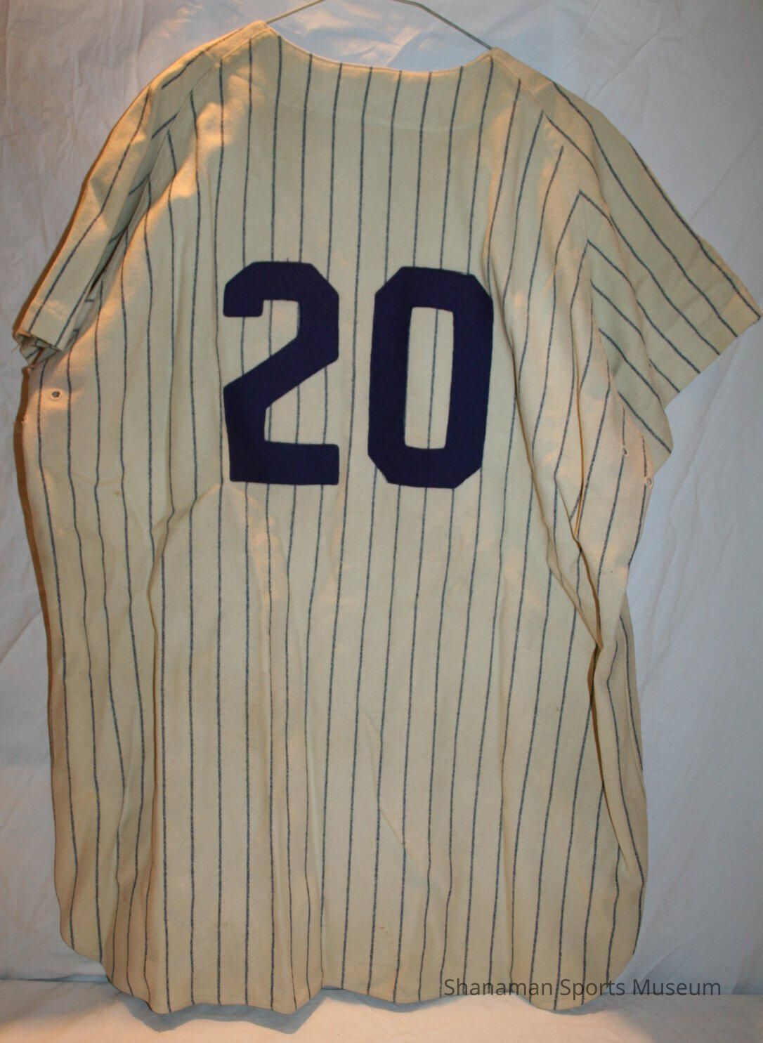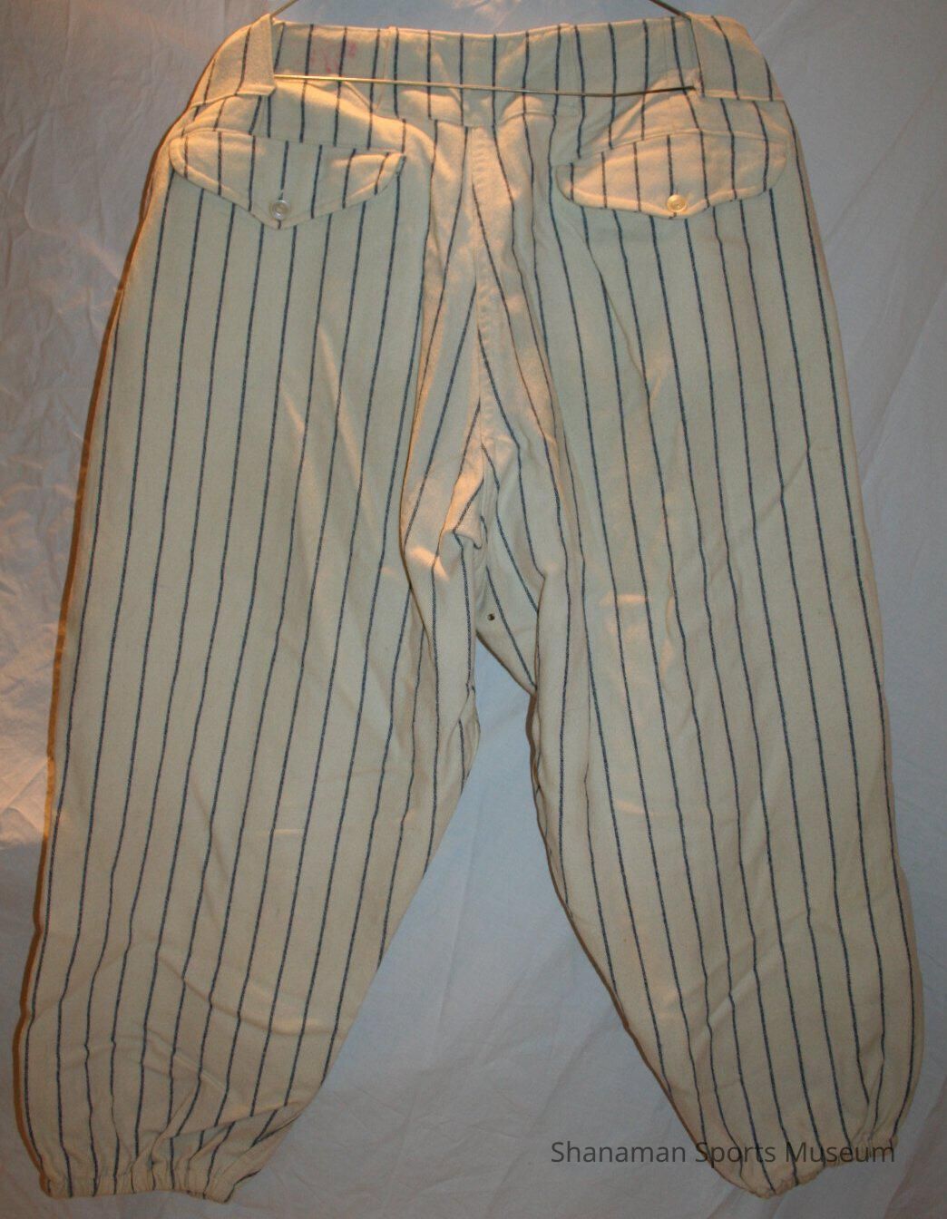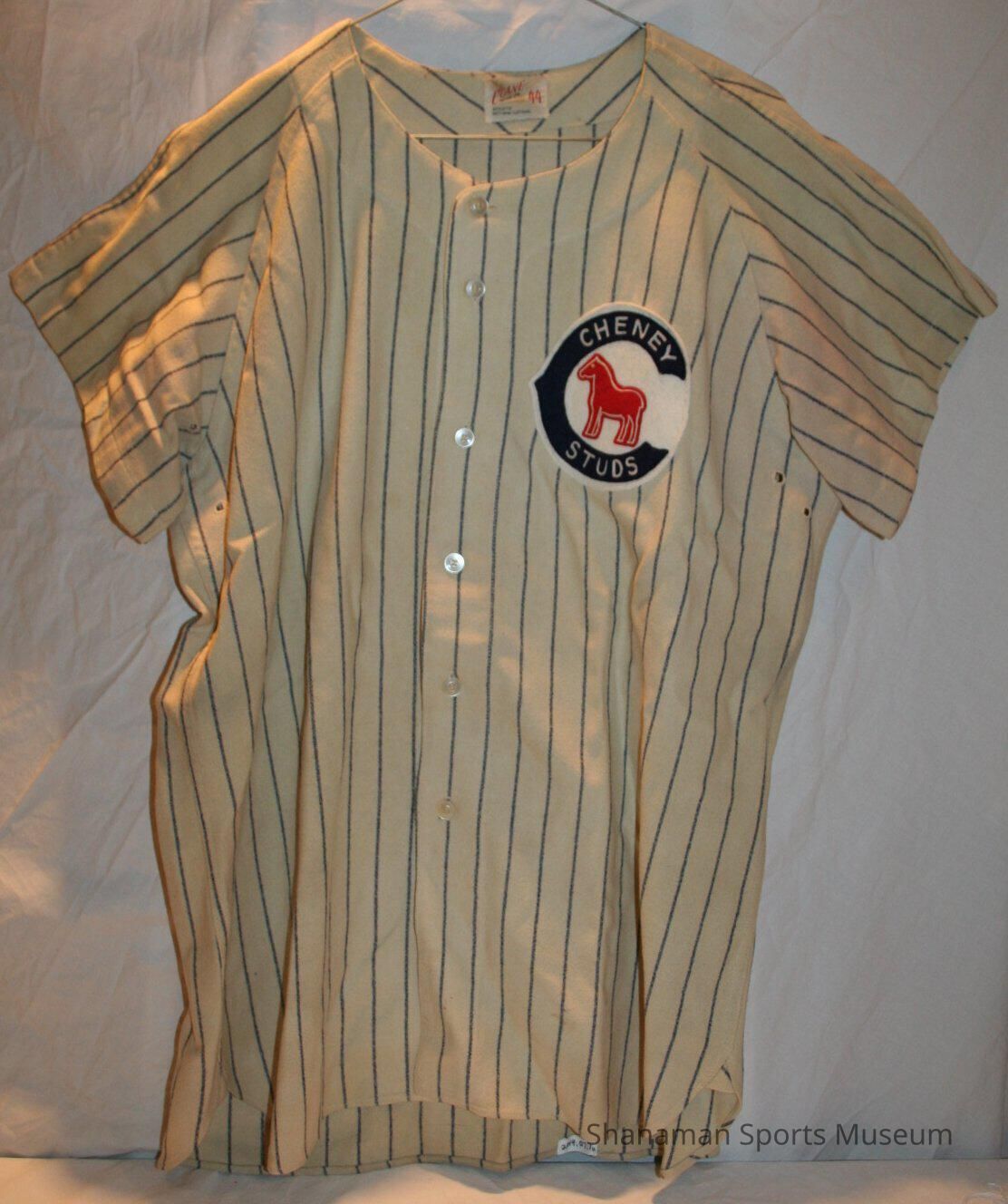 Baseball Uniform- Cheney Studs. Worn by Bob Walker while playing for the Studs in the 1960s. A= shirt, white wool with blue pin stripes, short sleeve, buttons down front, Cheney Studs patch on left chest, number 20 on back. B= pants, white wool with blue pin stripes, button fly.Lexicon