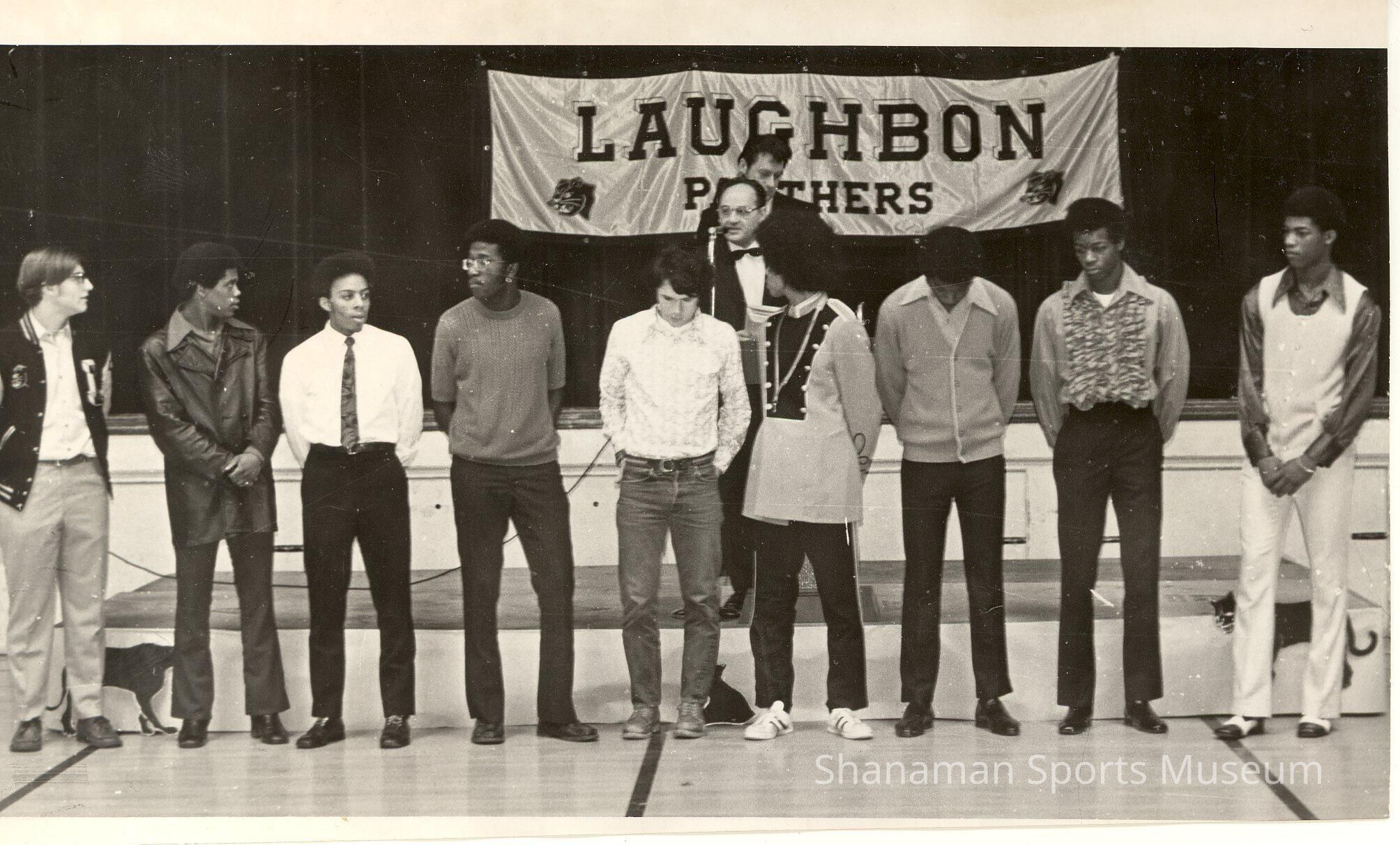 Photograph- b/w, members of the 1971-72 Laughbon HS mens basketball team lined up at a school assembly. The team were the 1971-72 East Central League and Southwest WA District League champions.Lexicon