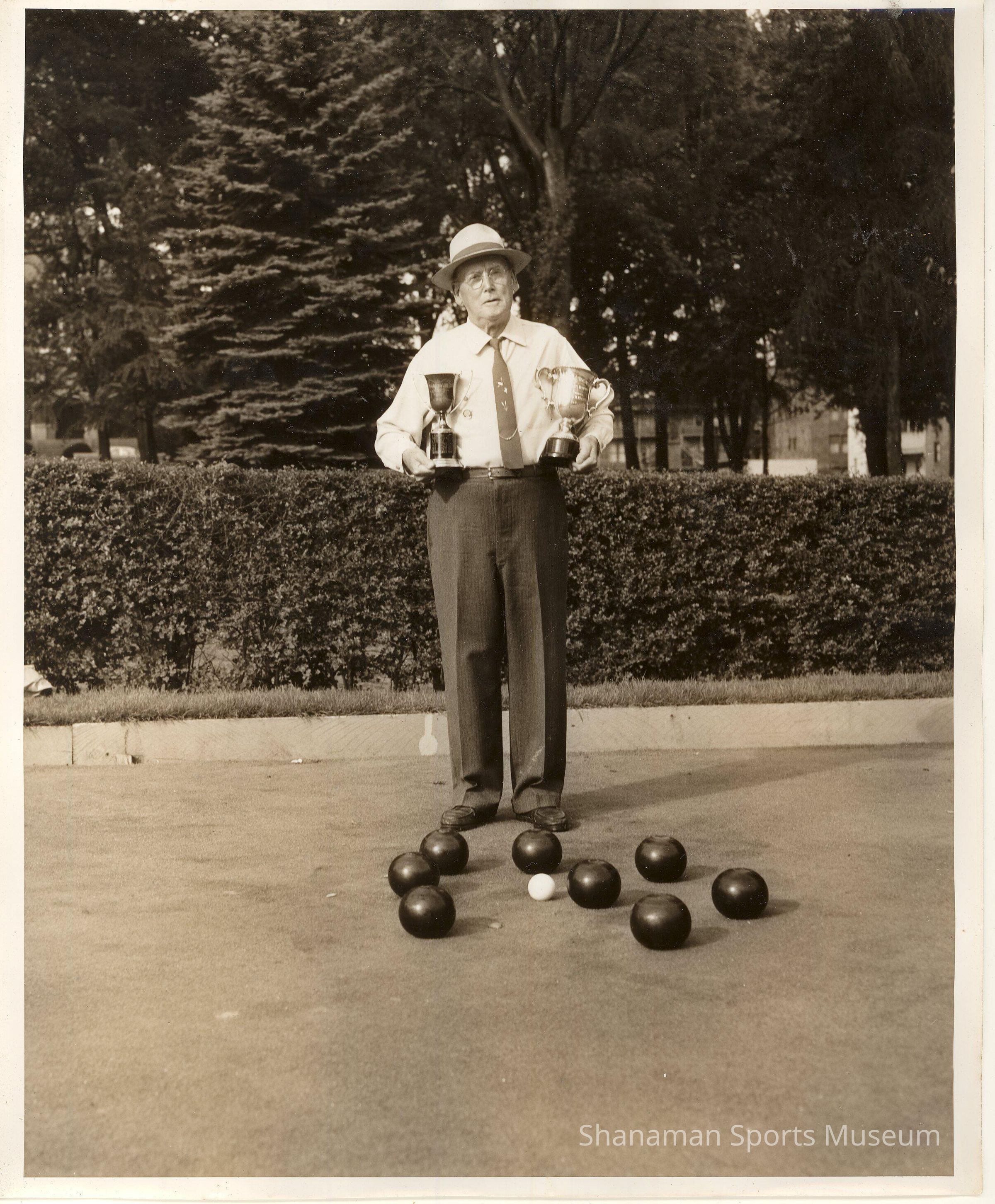 Standing on a lawn bowling rink for this black-and-white photo taken in 1957, Arthur Green holds two trophies he had won. Lawn bowling is an old, old game, played in England back in the 1200s. The oldest bowling club in the world was established in 1299 and is still active and popular today. Back in 1957, Green was the runner up at the American Lawn Bowling Association's national open in Tacoma.Lexicon