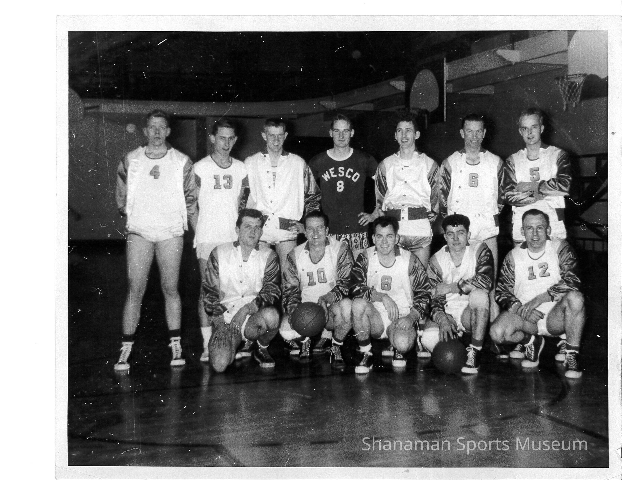 Twelve members of the 1953 West Coast Grocery Company basketball squad poses for a team photo. Francis "Bosco" Reopelle is second from the right on the front row.Lexicon