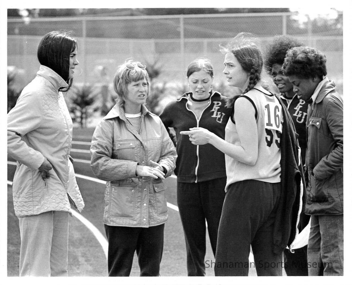 Pacific Lutheran University coach Angie Eichholtz, second from left, talks to the women’s track team during its inaugural season in 1971. The team had three meets in ‘71, performing well in each according to the school’s yearbook.Lexicon