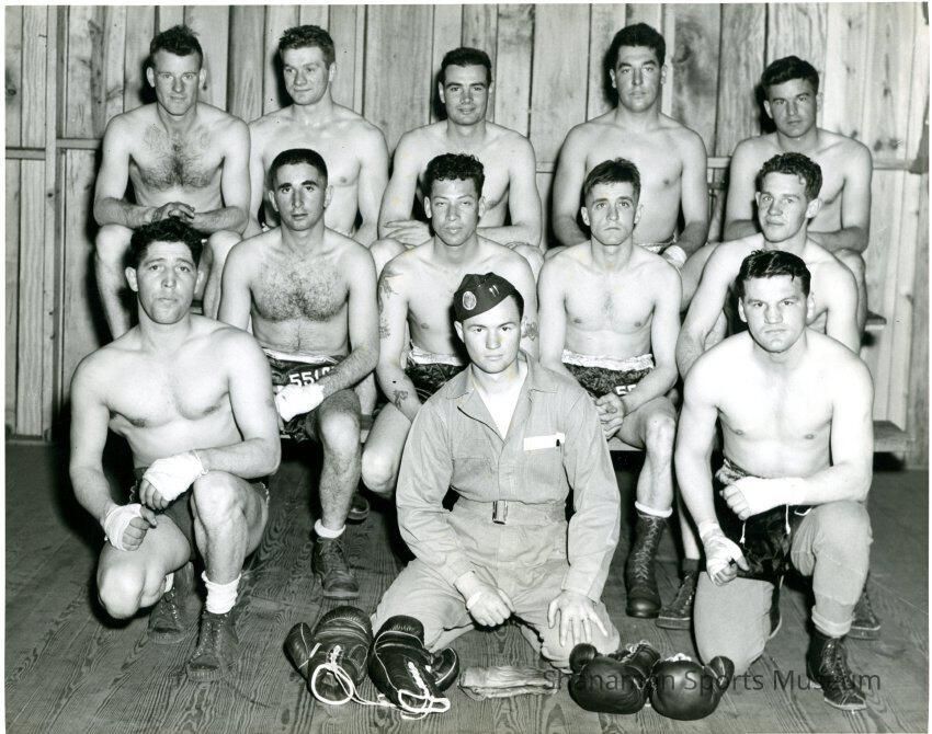 Photograph, b/w of the 551st boxing team, c. 1942. Bliss Croft, kneeling front, center, Croft was a Tacoma native and was an accomplished boxer in the 1940s. He served in the air force in WWII and was on the camp boxing team while stationed at Camp Mackall, North Carolina.Relationships