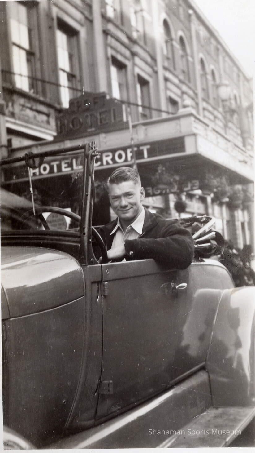 Photograph, b/w of Bliss Croft parked in a car outside Hotel Croft, c. 1940s. Croft was a Tacoma native and was an accomplished boxer in the 1940s.Relationships