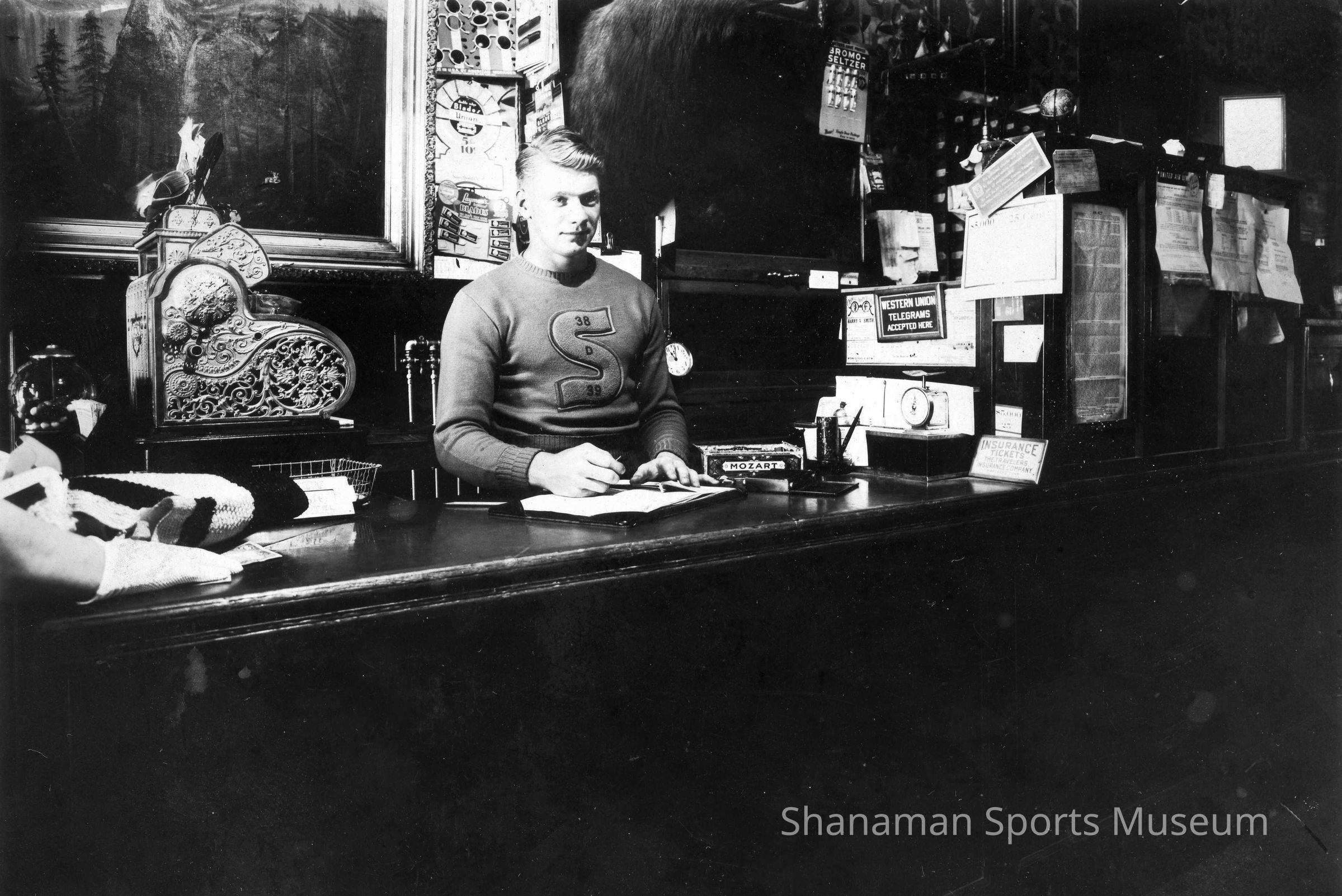 Photograph, b/w of Bliss Croft in 1939 sitting behind a desk wearing a Stadium High School letter sweater. Croft went on to play football for Pacific Lutheran College and was an accomplished boxer in the 1940s.Relationships