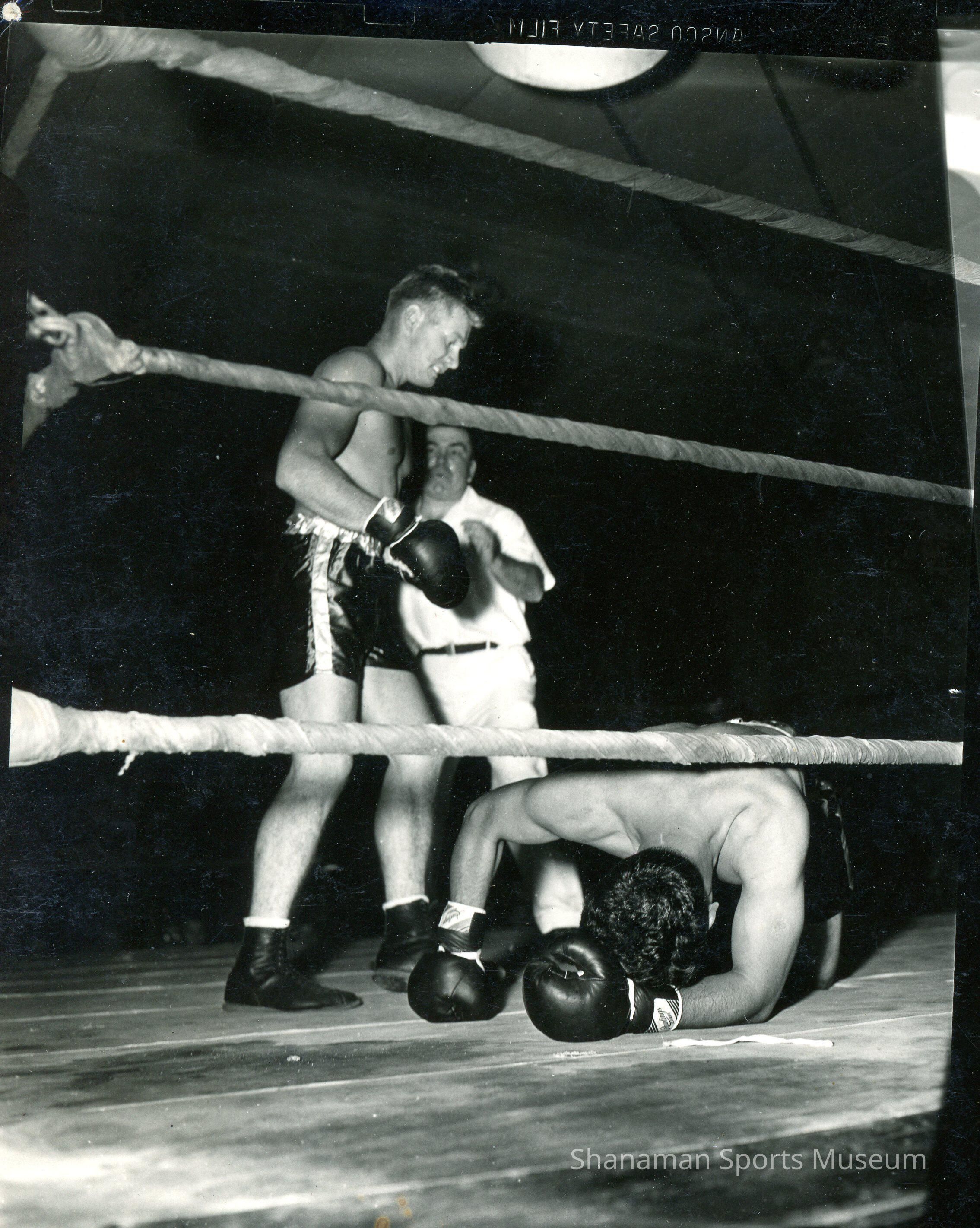 Photograph, b/w of boxing match between Bliss Croft and unknown opponent. Croft was a Tacoma native and was an accomplished boxer in the 1940s.Relationships